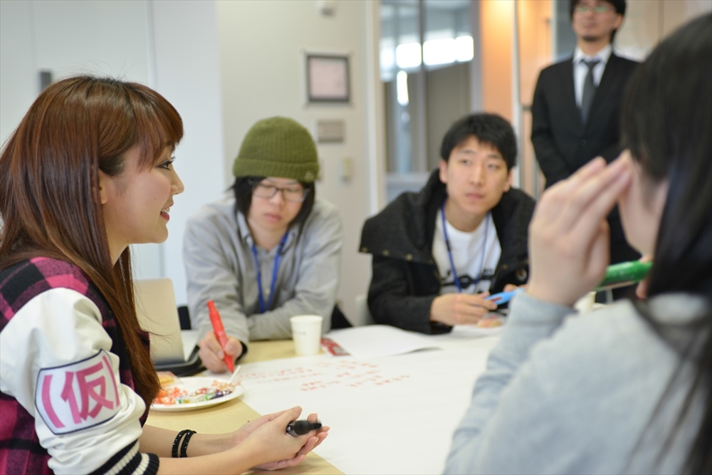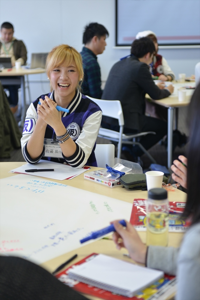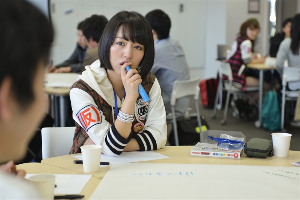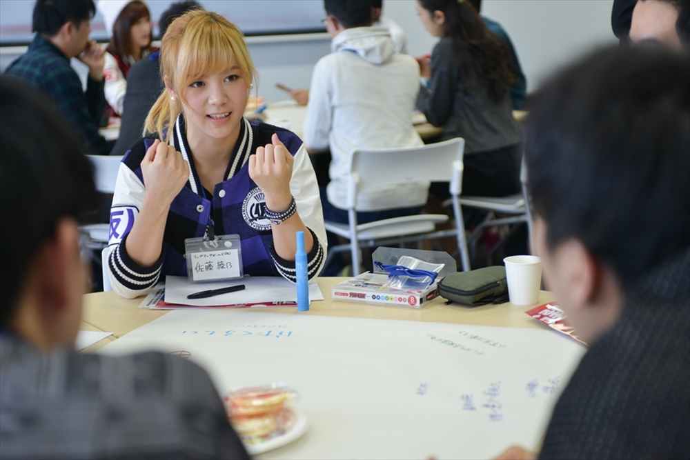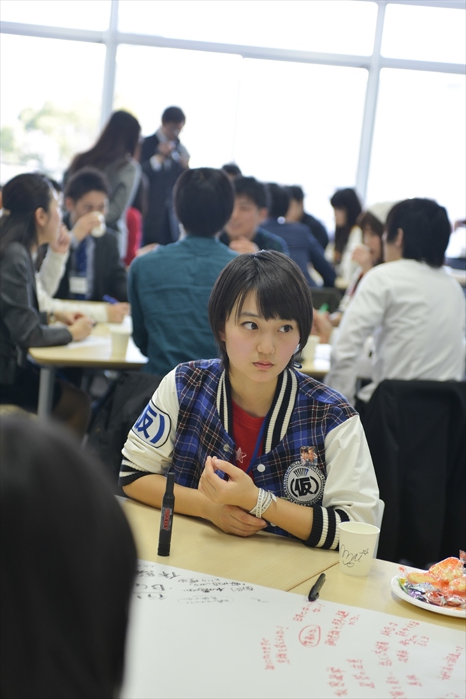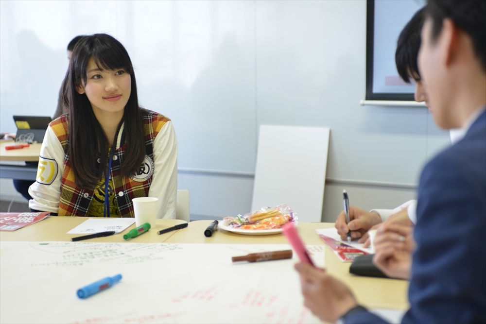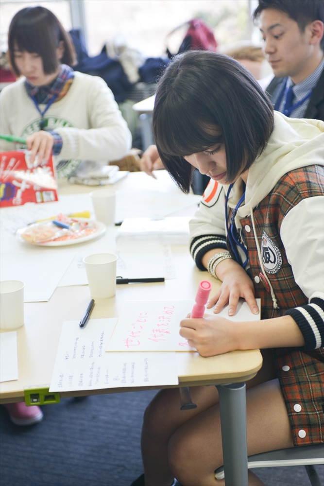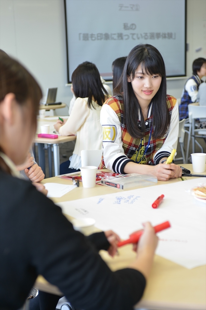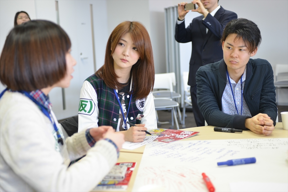 このワークショップには、東大生や若者選挙ネットワークの方々等とともに、学生達と同世代でも有り、何にでも前向きにチャレンジするグループで有るという事から、アップアップガールズ(仮)も参加し、参加者とともに投票をかっこよくするアイデアについて考えた。