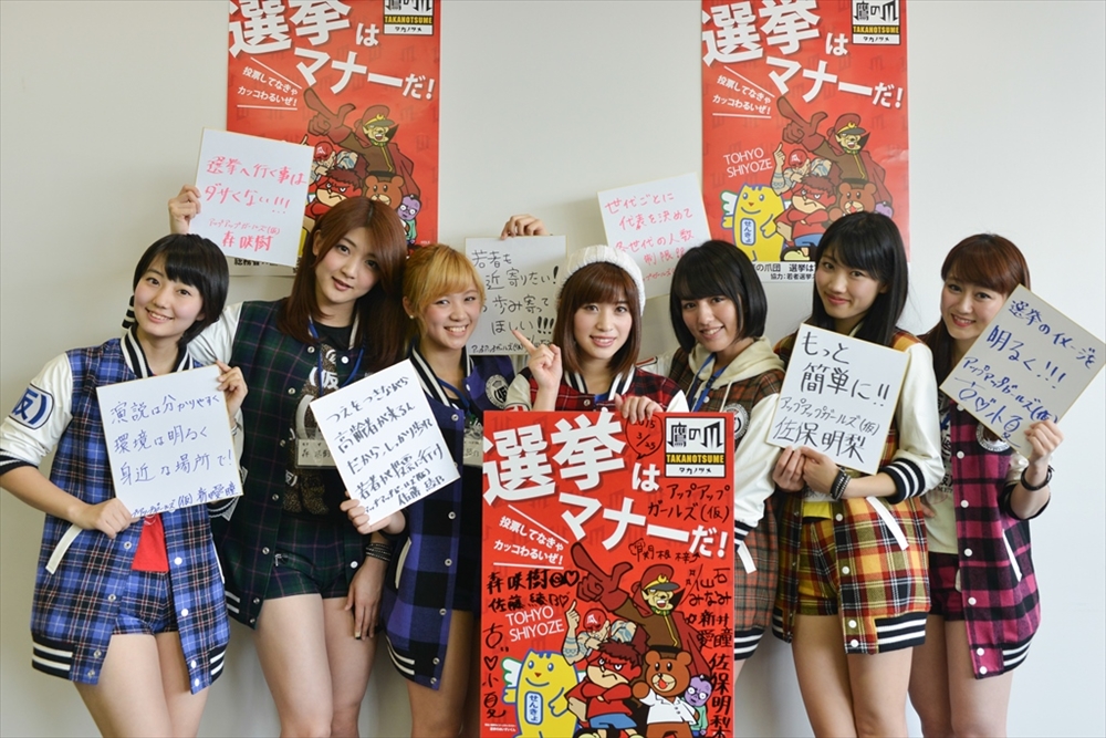 3月25日、来たる統一地方選挙に向け、東京大学駒場キャンパス内東京大学ブランドデザインスタジオにて、総務省「選挙はマナーだ!」キャンペーンの一環として、総務省、明るい選挙推進協会及び東京大学教養学部「ブランドデザインスタジオ」主催による「投票をかっこよくする100のアイデア」と題したワークショップが開催されアップアップガールズ(仮)が参加した。
