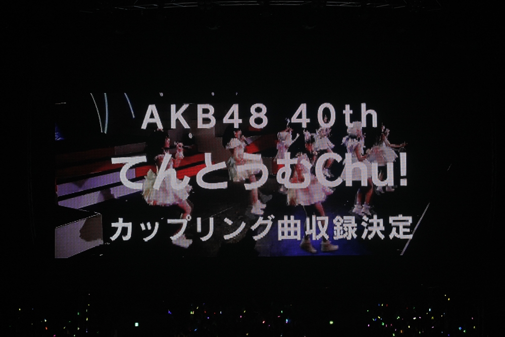そして、アンコール後のMCでは新ユニットの発表がサプライズで行われました。その名も「てんとうむChu!」に続く「でんでんむChu!」。メンバーは大和田南那、向井地美音、村山彩希、田中美久、矢吹奈子、川本紗矢、谷口めぐの7名。向井地は「てんとうむChu!さんのライバルなのか仲間なのか未だわからないですけど、(AKB48の)40thのカップリング曲ということで、うれしくてうれしくてたまらないです。」と目を輝かせていました。HKT48からの選出となった矢吹奈子と田中美久は「うれしいです。けどまだ意味が全然わからないです。」とメイキング撮影だと聞いて本日会場に来ていただけに、とても驚いていた様子でした。