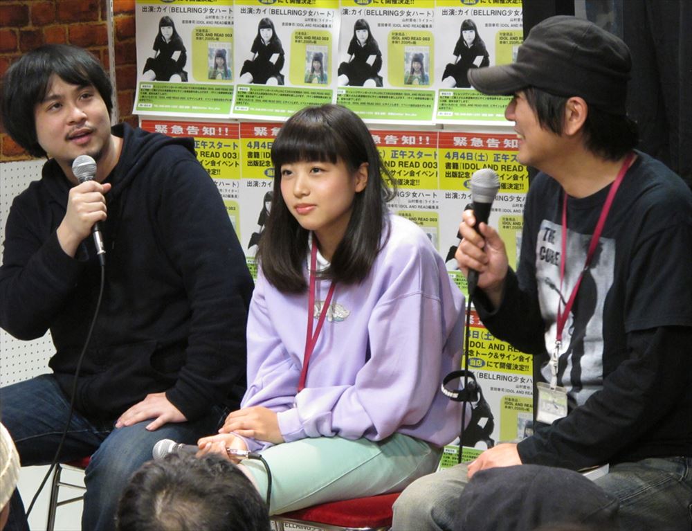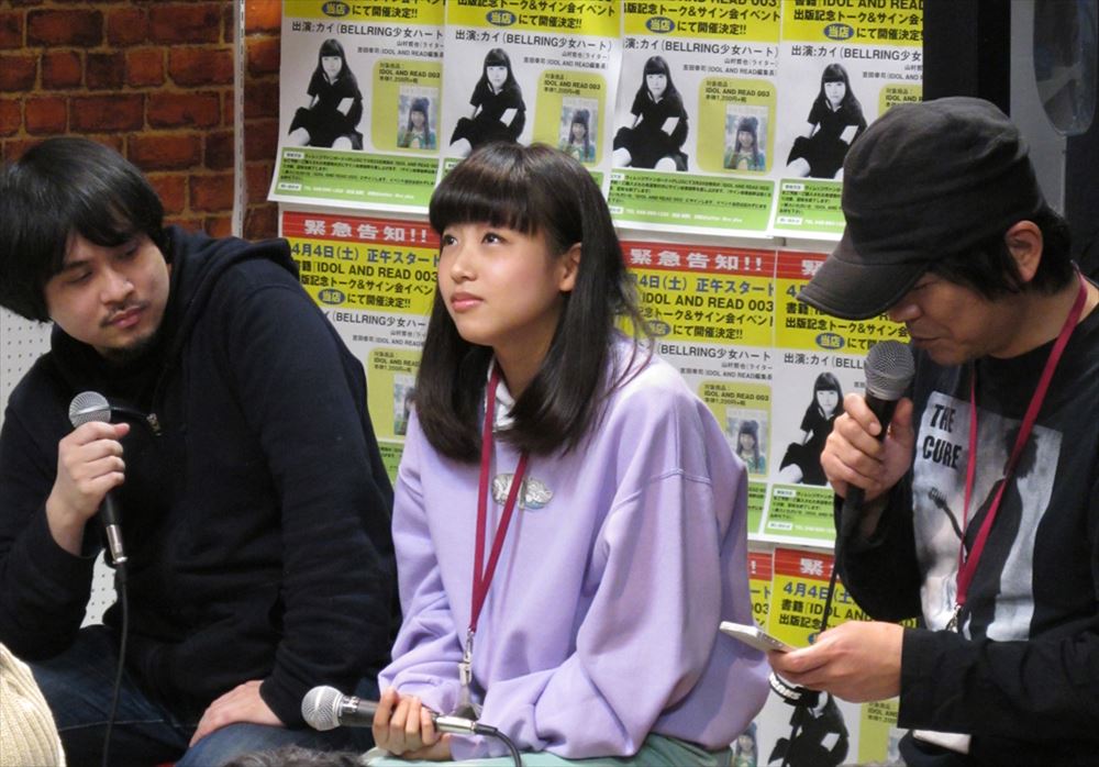 場内満員のファンを前に、カイ(BELLRING少女ハート)、田中紘治氏(ディレクター)、吉田幸司(IDOL AND READ編集長)が登場、山村哲也氏(ライター)の司会でイベントがスタートした。