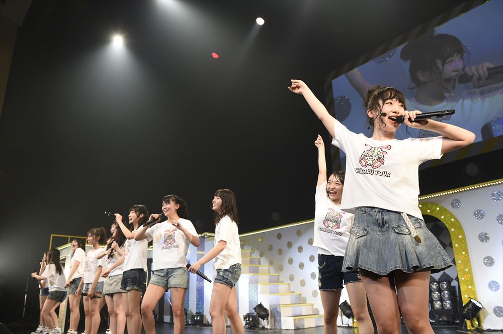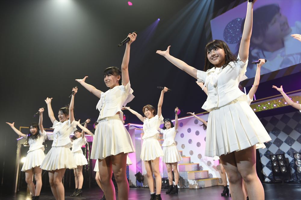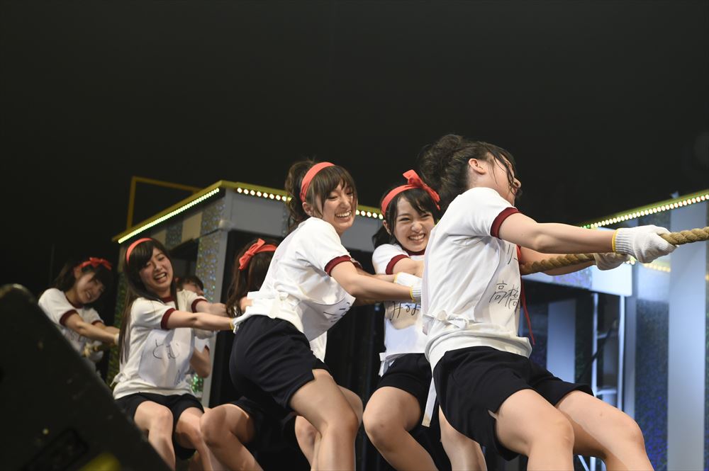 途中MCでは、小嶋真子と大和田南那のゆるゆるトークコーナーがあり、天然発言がさく裂した小嶋を後輩の大和田が突っ込みつつも、「シリーズ化していきたい!」と小嶋は笑顔で意気込んでいた。また「アイドル適正検査」と題して体育着に着替えたメンバーたちが、高橋率いる赤組と、中西率いる白組に分かれ、アイドルに必要な知力(常識クイズ)・体力(綱引き)・時の運(黒ひげ危機一髪)を競い合う。常識クイズでは、現役大学生の内山がいる赤組が勝ち、黒ひげ危機一髪では黒ひげが飛ばないという奇跡(?)に見舞われつつも、最後は昨年のじゃんけん大会で上位に勝ち残った平田(赤)と川本(白)でのじゃんけん対決。見事赤組の平田が勝ち。そして逆転を狙った綱引きでも、マイクを置いてガチに戦った末、またもや赤組が連勝。ご褒美として、次の曲「今、Happy」を勝者の赤組メンバーが披露した。