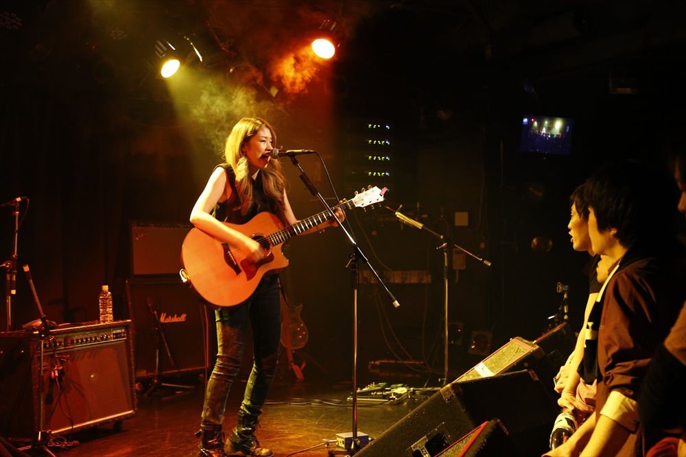 オープニングアクトとして登場したのが、葵ミシェル。心に溜まった感情を吐き出すように唄った『ロクデナシ』や、もの悲しい歌声や音色の中に温かさも滲み出た『you』など、得意のブルーズな香り漂わせる演奏を爪弾きながら、芯の太い声を魅力に、哀愁漂わせた歌の数々を届けてくれた。