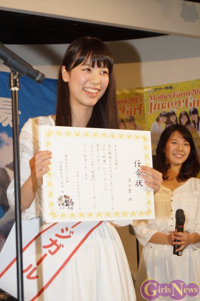 溝口恵さんは「私、本当に動物が大好きなので、マザー牧場のイメージガールができると聞いて本当に嬉しかったです。マザー牧場の動物たちを手なずけたいと思います。」
