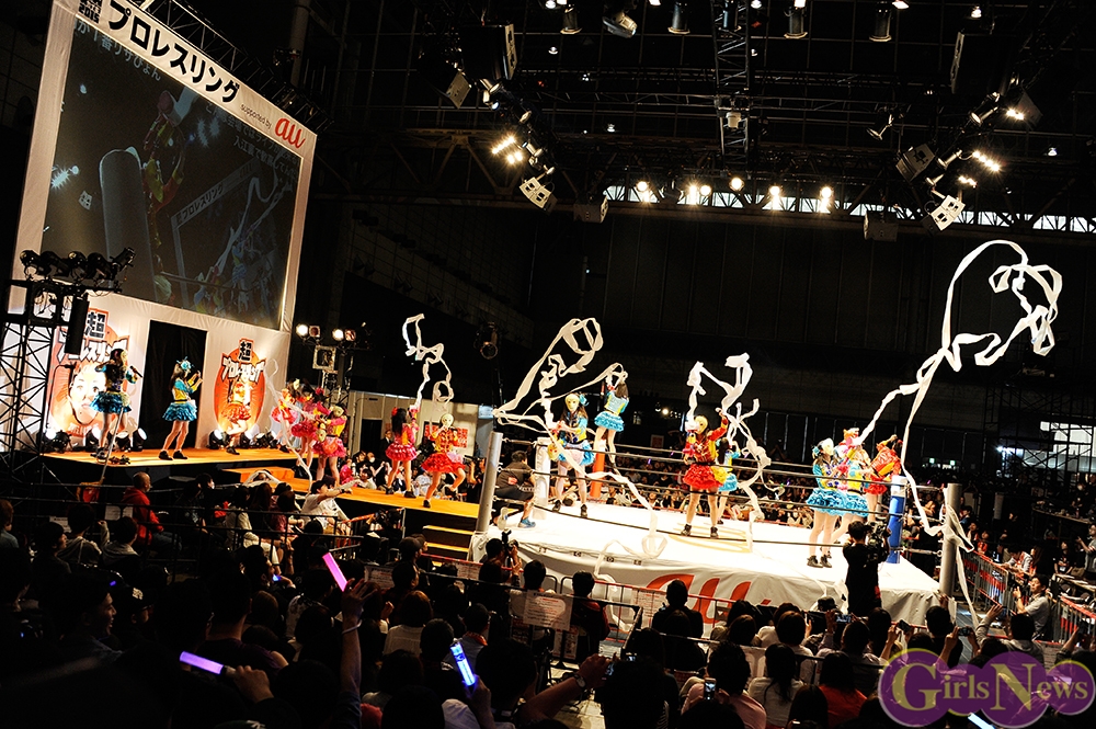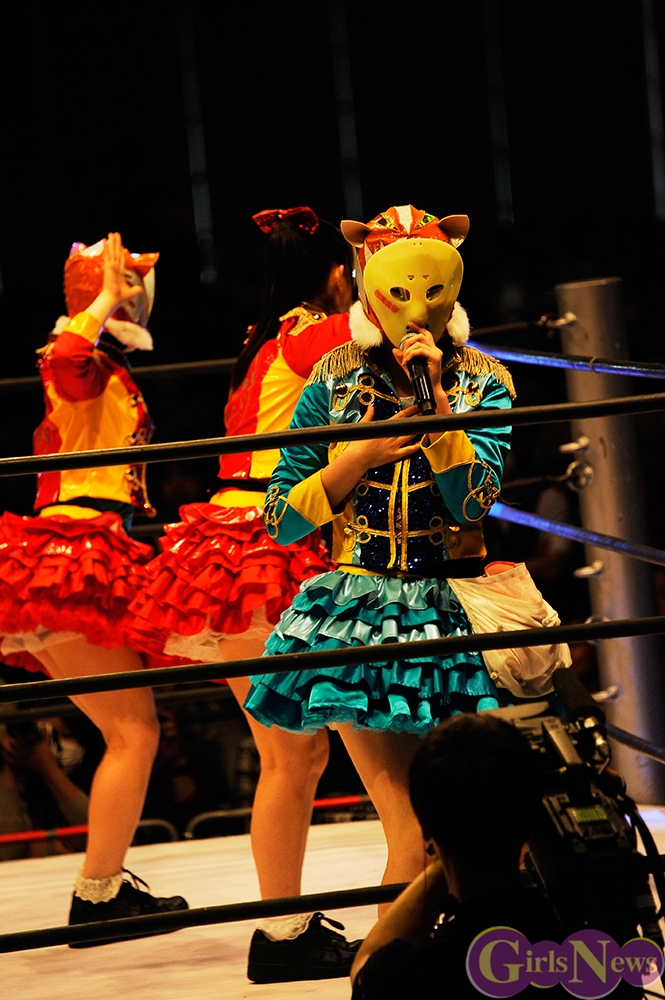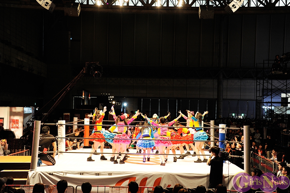 時間いっぱいになると、入場テーマが流れ、仮面女子の登場。アーマーガールズやスチームガールズとゆっくりと現れ、やがて仮面女子が揃う。