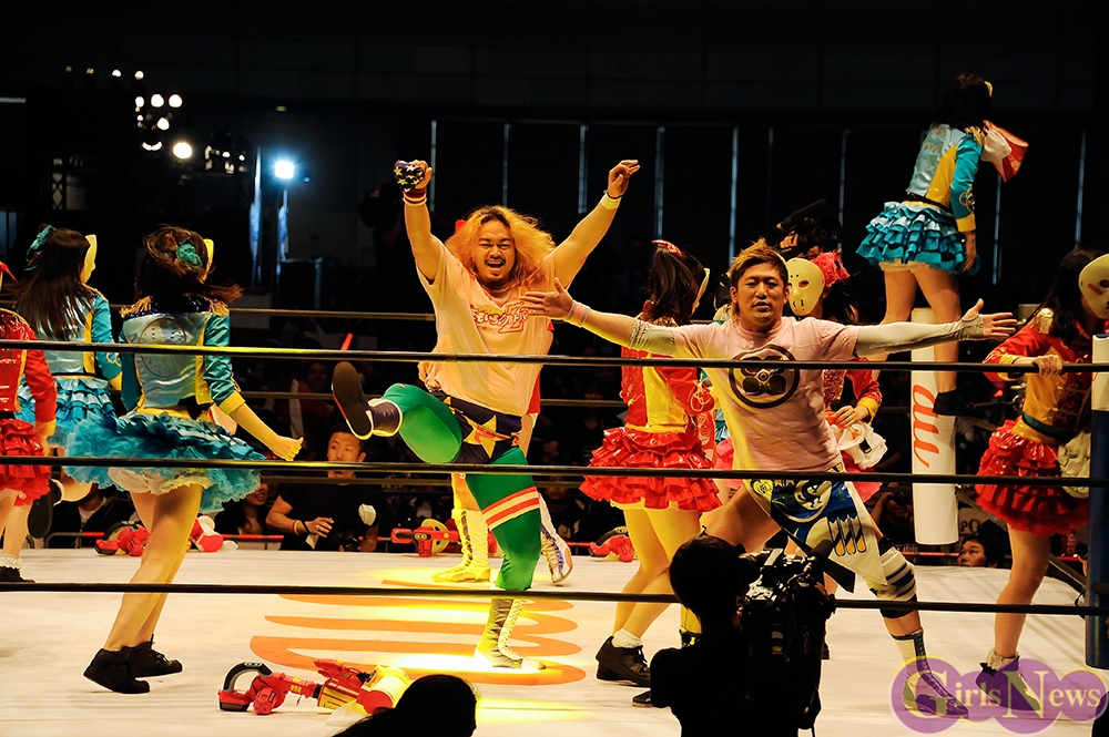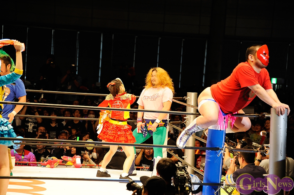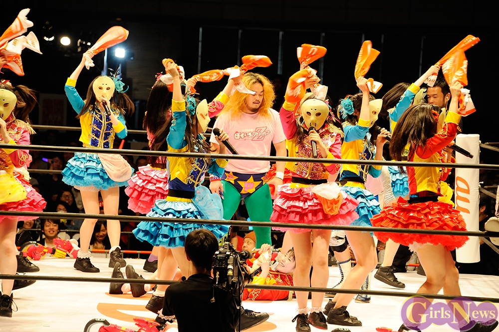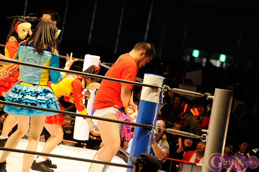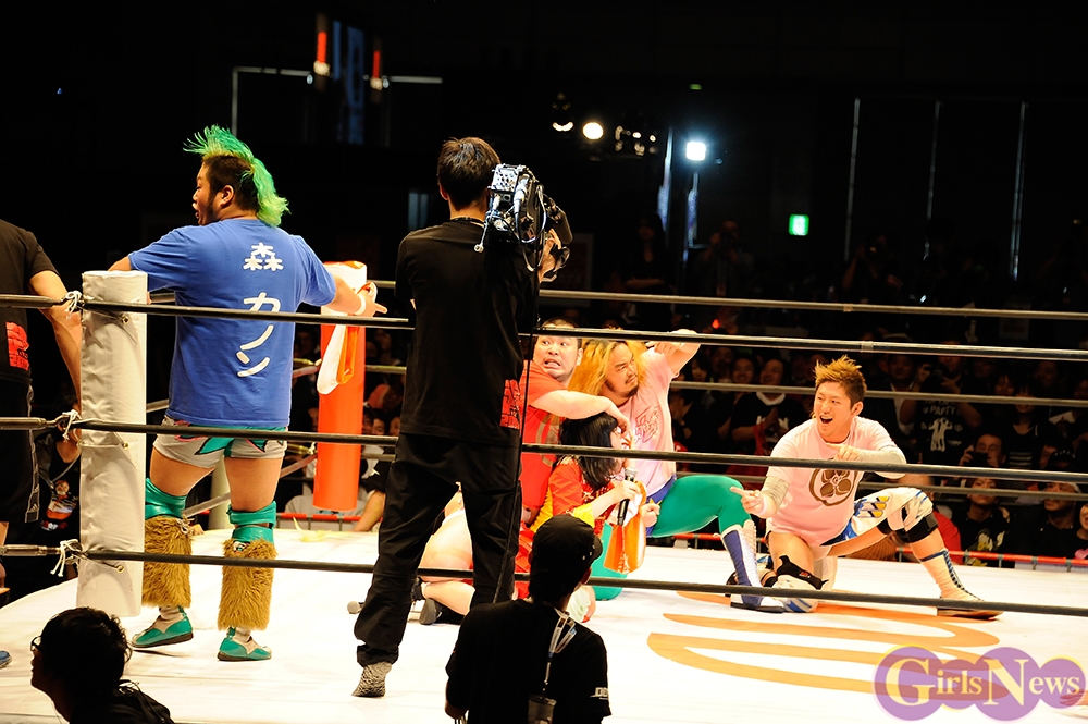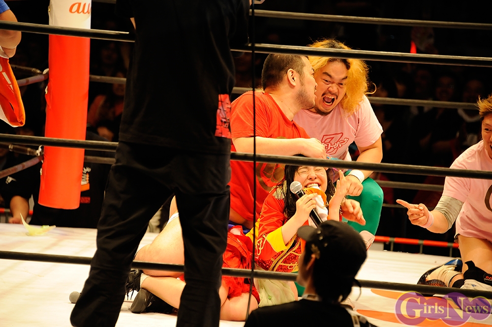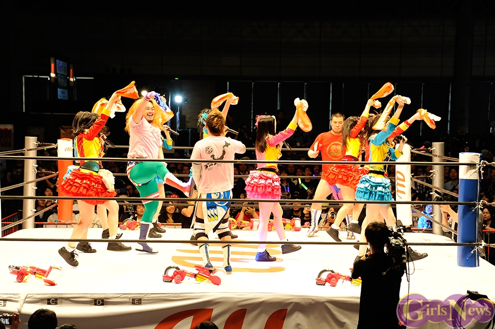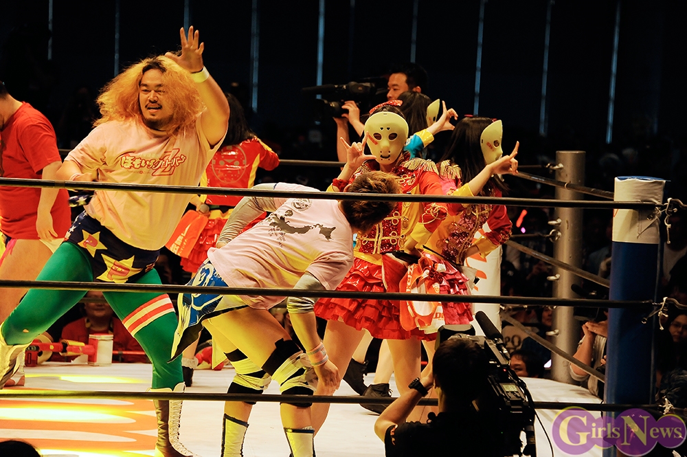 放送事故もあわやと思われたがその時、第3試合で戦った入江茂弘が乱入し仮面女子を助ける。そして共に現れたヨシヒコ選手(人形)が大石真翔に投げ技を決め、そのままホールドし、仮面女子は最後まで歌いきった。