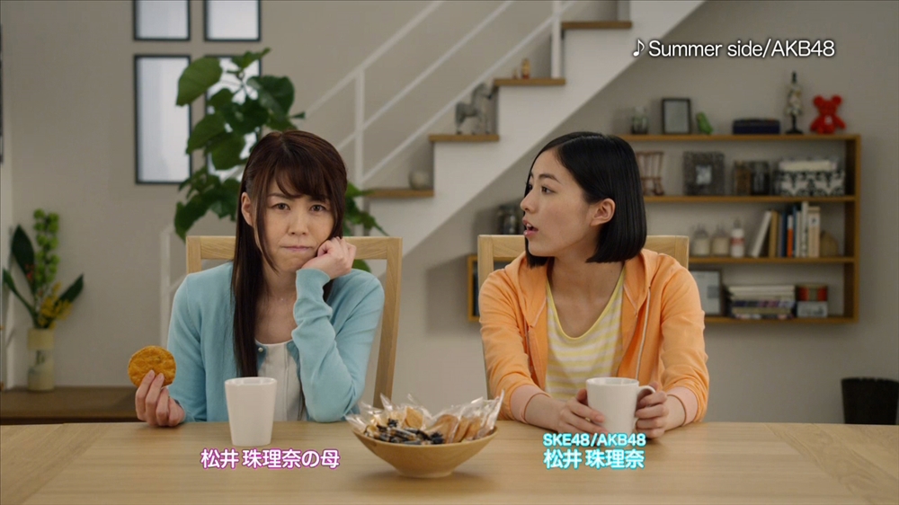 母親とCMで共演できたことについて、松井珠理奈さんは「お母さんが仕事の現場にいて、自分が仕事してるところを見られてると思ったら私の方が緊張しちゃいました。いつもより表情が硬いです。」と母親との共演に緊張していたことを語っていた。