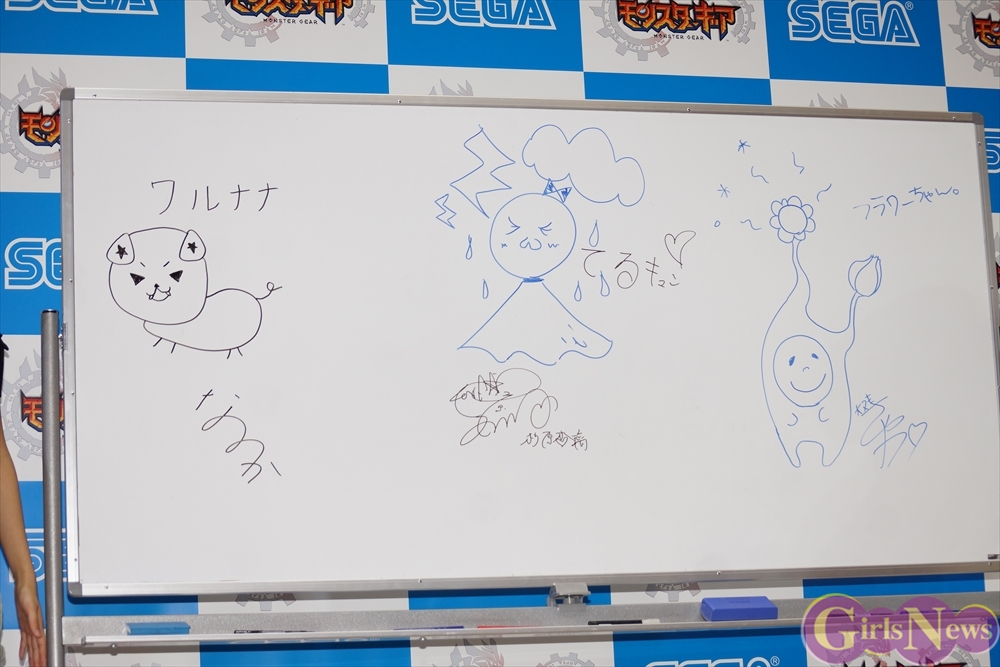 この日はモンギアガールズに即席でモンスターを描いてもらい、モンギアの中村プロデューサーは「全部採用します!」とモンギアガールズが描いたモンスターをゲーム内に登場させることを約束。