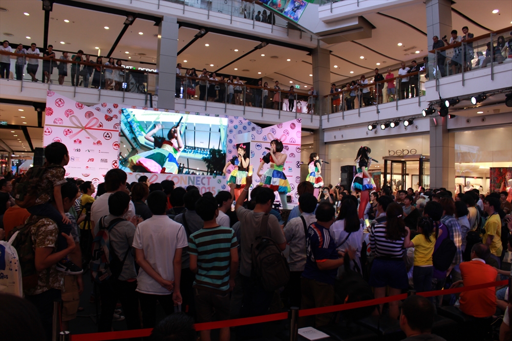 ライブが始まるとステージ周りには、現地のアイドルファンはもちろん、たまたま会場となったショッピングセンターCentral World に足を運んだ人々などが大集結。