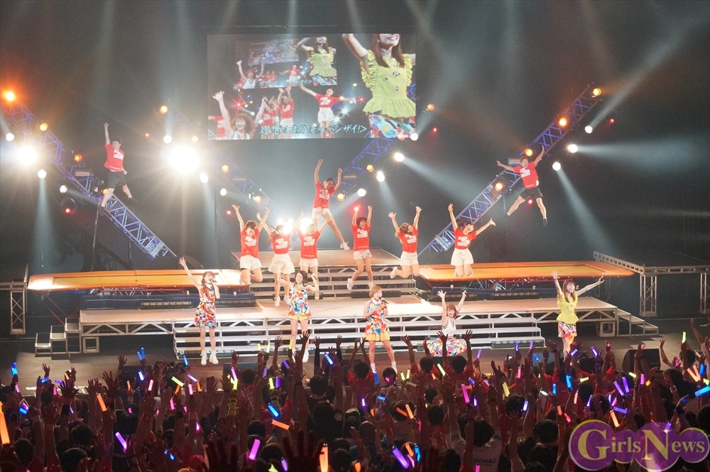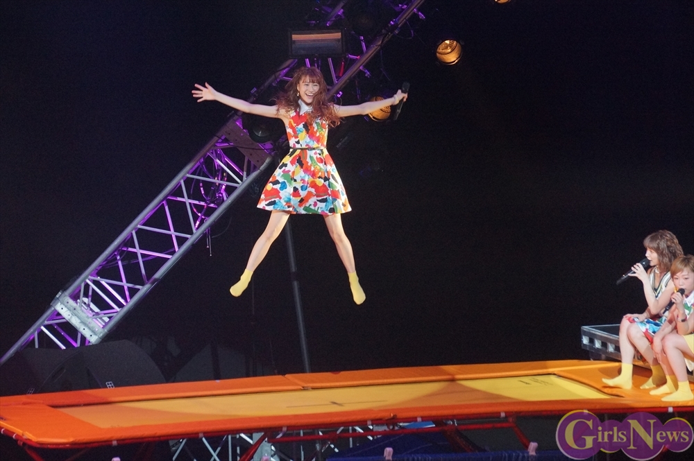 前半戦終わりから一転、後半戦は勢いのある曲で畳み込んでいくと、『さぁ来い!ハピネス』では囲み取材でも軽く披露されたトランポリンが登場。秋山ゆりか以外が次々と跳び上がり楽し気に会場を盛り上げる。曲中の自己紹介パートで申し訳程度に跳ぶ秋山ゆりか。