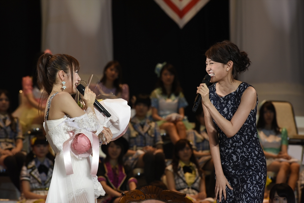 11位には北原里英が入り、新たに発足するNGT48のキャプテンとして参加した初の選挙で、自身にとって最高順位に。「これで胸を張って新潟に行けます!」と満面の笑みを見せました。年内での卒業を控えている高橋みなみは4位に。投票してくれたファンの皆様に感謝の気持ちを伝えるとともに「必ずファンの人たちが見ていてくれる。これだけは私がAKB人生で言えることです。だから諦めないでね」とこれからのAKB48を担う後輩たちにメッセージ。大きな拍手が鳴り響く中、同期の卒業生である前田敦子がサプライズで登場し、「お疲れ様と言いたいです」とねぎらいの言葉をかけ、高橋みなみを抱擁しました。
