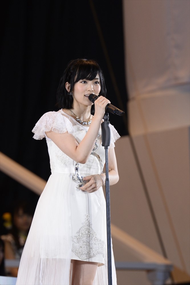 応援をしていただいた皆さん、本当にありがとうございます。去年念願の1位を取らせていただいて、大雨の中、スタジアムのステージで、約7万人のまゆゆコールや沢山の温かい熱い声援をいただいて、本当にあの景色は今でも脳裏にこびりついて離れませんし、今でも耳で鳴り響いているくらい、一生の宝物だなと、今も思います。今年の目標は2連覇と掲げていたんですけど、やっぱりAKBの歴史で連覇を成し遂げた人はいないので、実に難しいものなんだなとあらためて痛感しました。もちろん、悔しい気持ちはありますが、今回3位という順位をいただいて感謝しています。正直、連覇は難しいかなと薄々感じてはいたのでしょうがないかな。でも、まだまだ現状に満足せずに私は負けず嫌いな性格なので、これからも常に上を目指して日々色んなことを、目の前のことに一生懸命に取り組んでいきたいと思います。