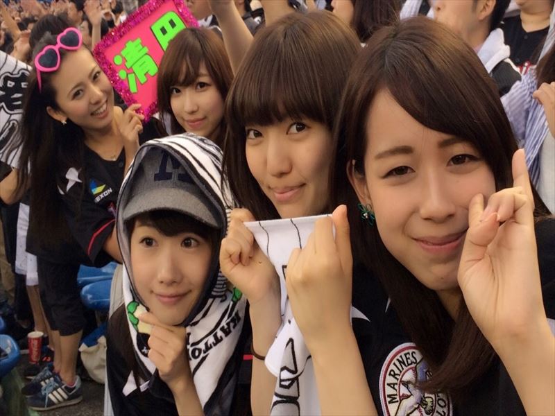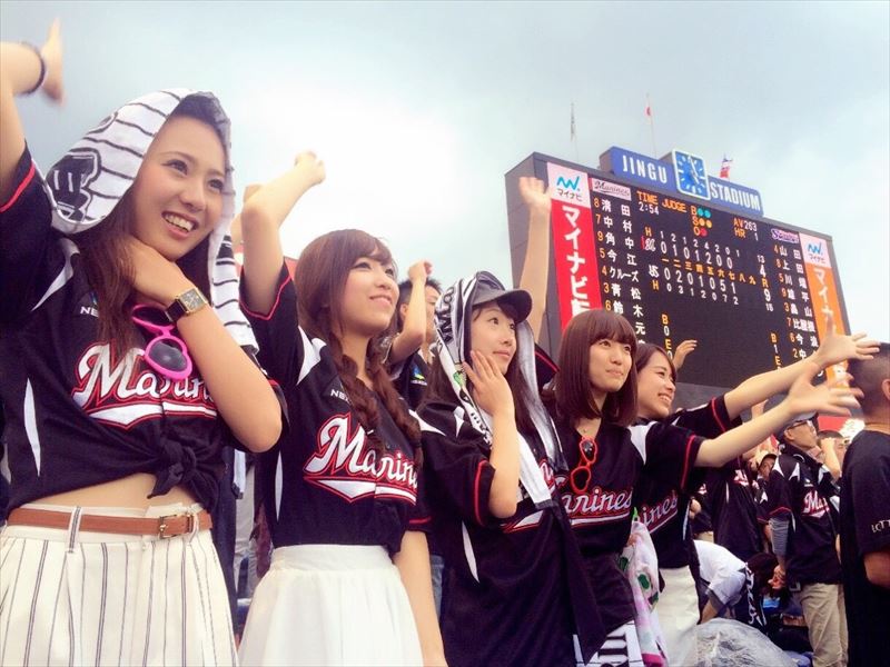 また、同じくメンバーの朝倉なおこ、平山美紗樹、外塚歩は、「外野応援席で、初めてのプロ野球観戦をしました!見よう見まねでしたが周りのマリーンズファンの方と一緒に応援歌を歌ったり、マリーンズファンの一員として盛り上がることが出来ました!!改めて球場の熱量を肌で感じ、野球界を盛り上げる一員として頑張ろうと思いました!!」(朝倉なおこ)