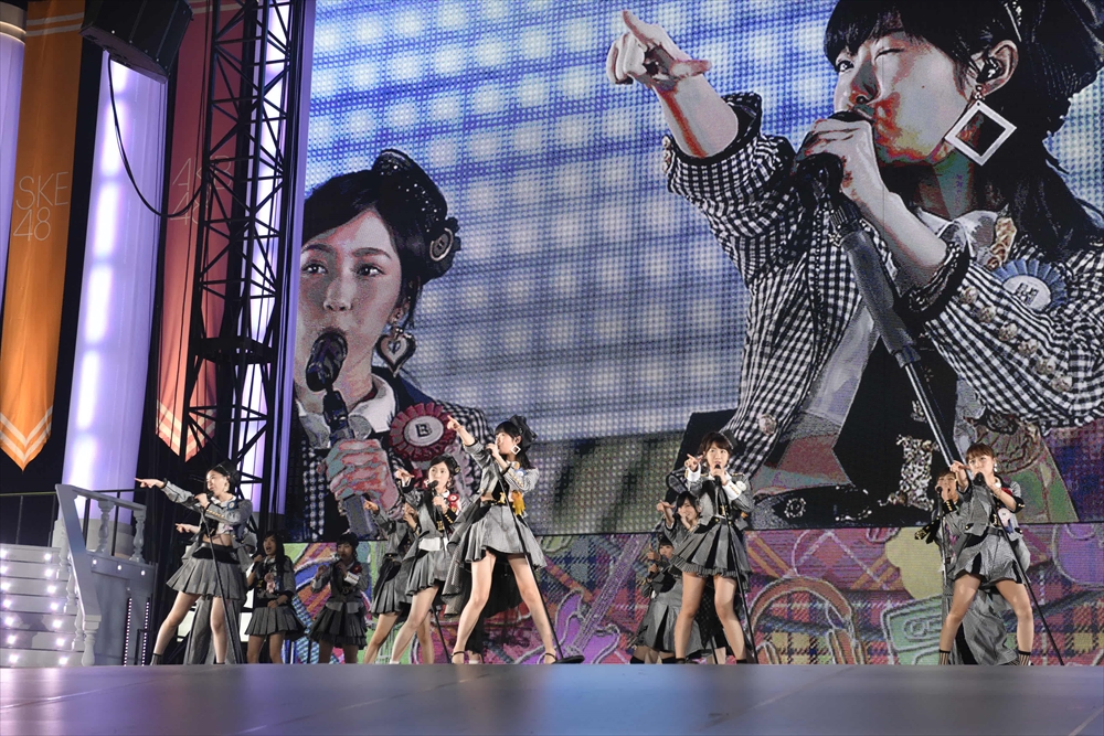 続いては、AKB48の各チームと姉妹グループが、世界旅行をテーマにステージを展開。チームAはキャビンアテンダントの衣装で「摩天楼の距離」、チームKは武藤十夢のドラムパフォーマンスと激しいダンスで「エリアK」、SKE48は松井珠理奈と松井玲奈によるタンゴを交えながら真紅の衣装で「強き者よ」、NMB48は山本彩のエレキギターソロから「パンキッシュ」を、それぞれ披露。チームやグループの個性をぶつけ合いました。