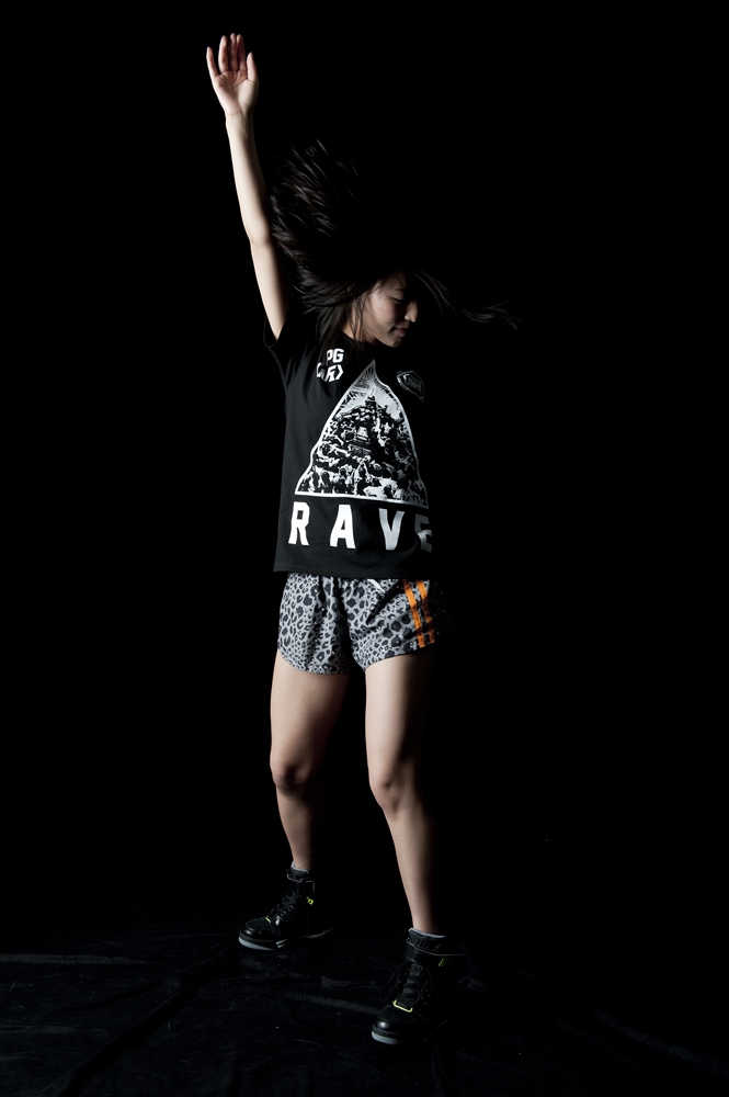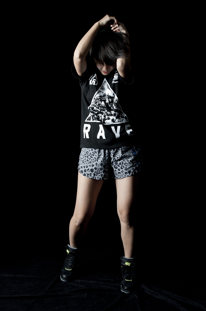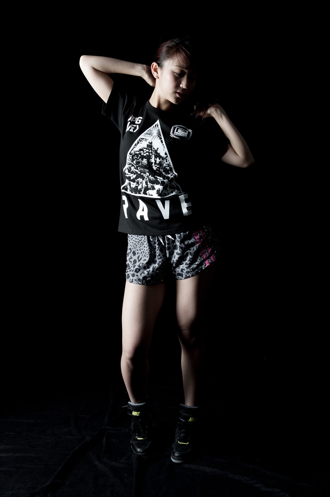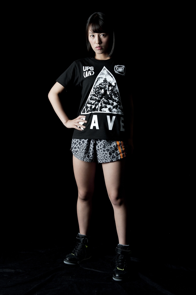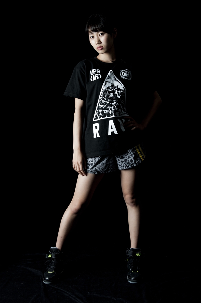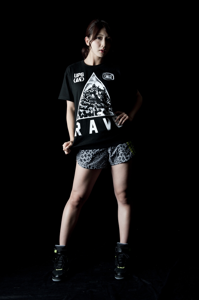 rvddwのバックボーンである「格闘技」とアップアップガールズ(仮)の皆様の「血と汗と涙」を感じさせる熱いパフォーマンスのクロスオーバーを打ち出した第一弾に続き、第二弾は野音での「祭り=RAVE」をコンセプトワードに狂乱のアプガ祭りを表現しました。フロントには日本の祭りの代名詞「神輿」と「レーザービーム」「野音」を組み合わせたエッジィなグラフィック、バックはアプガの皆様の日々「EAT(食べて)、WEIGHT(ウエイトトレーニングをして)RAVE(レイヴして/踊って)、REPEAT(その繰り返しだ)」を表現したレタード、オーセンティックなタイポグラフィを夜光インクで仕上げました。