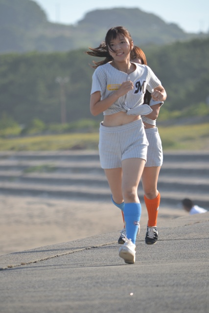 瀧行を終え、海上山妙福寺現主の廣野観匡氏から説法を受けた後、マリーンズ カンパイガールズは声出し、筋トレのため犬吠崎に移動。メンバー6人で「ビールいかがですかー」「本日1杯350円です、いかがですかー」など、7月28日の半額dayを想定した声出しの練習を行った後、1キロマラソン、筋トレで1日を締めくくった。