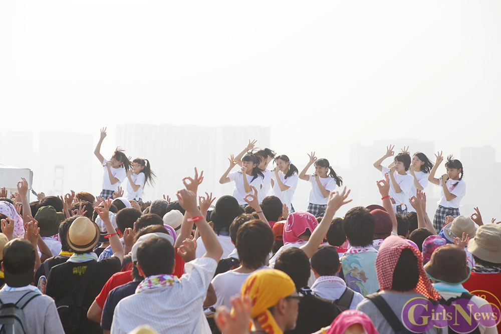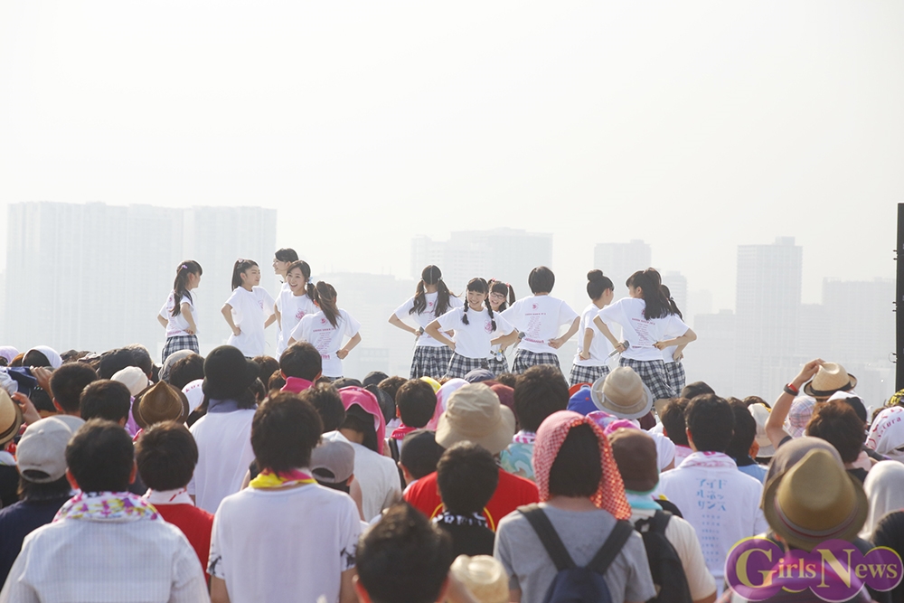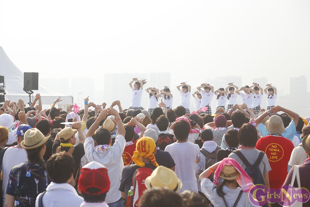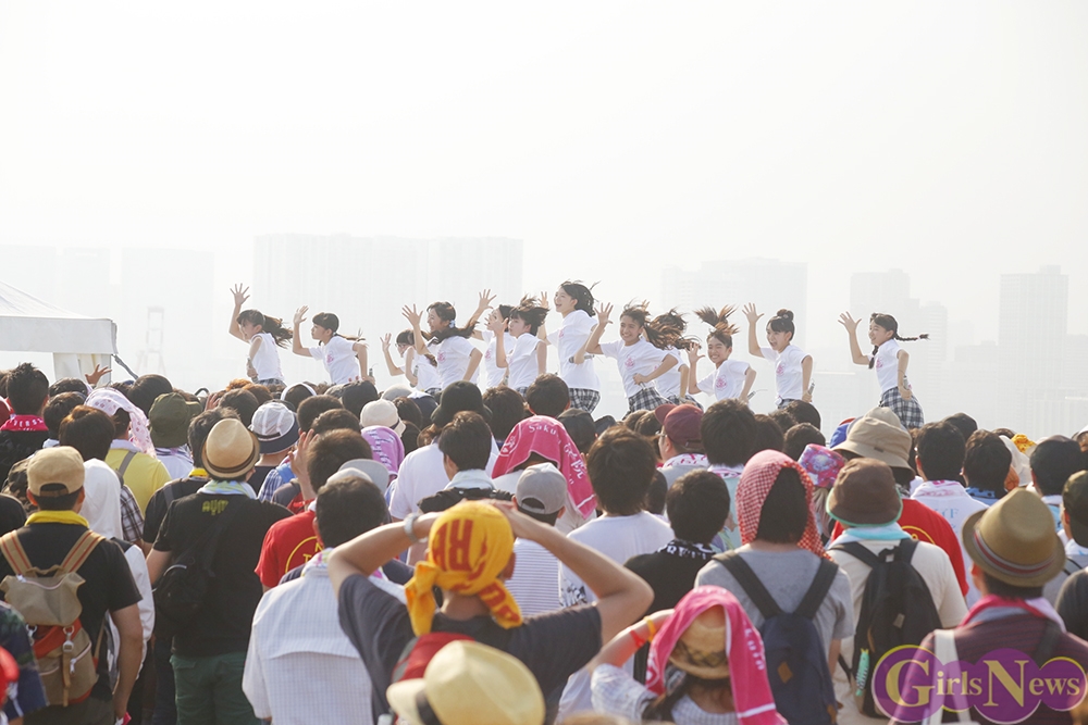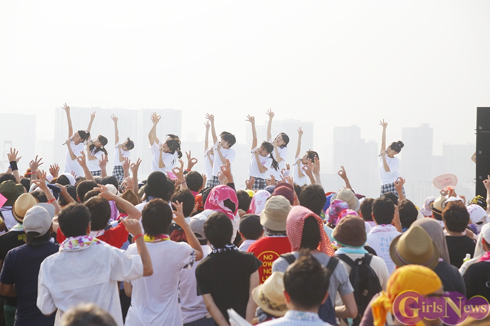 毎年、多くの思い出を残すフジテレビ湾岸スタジオ屋上SKY STAGEにはさくら学院が登場。少し涼しくなった夕方の時間帯をピンクのフラッグで淡く彩る。