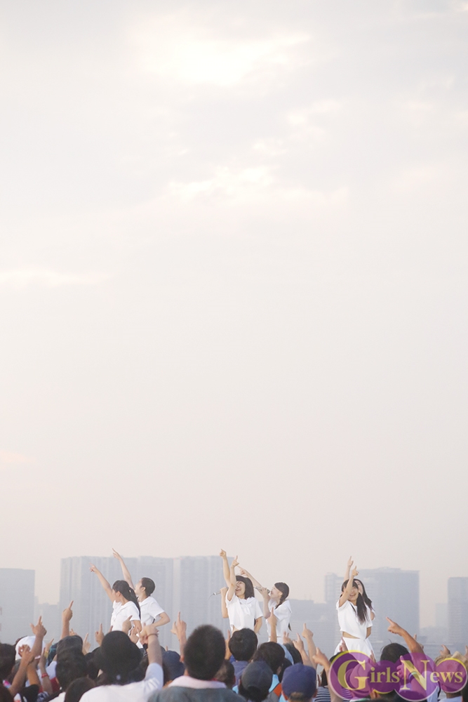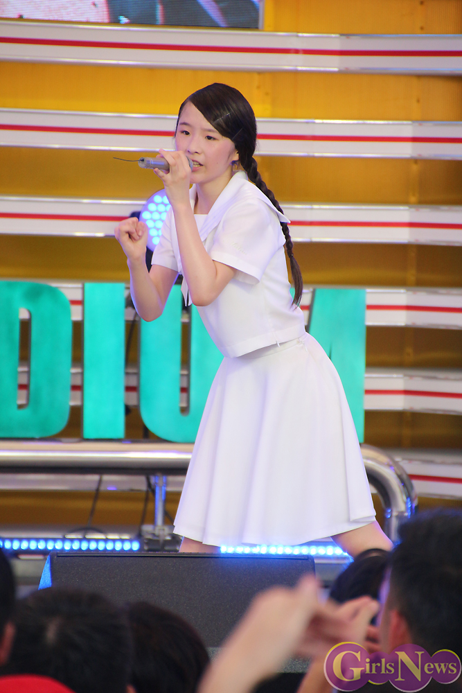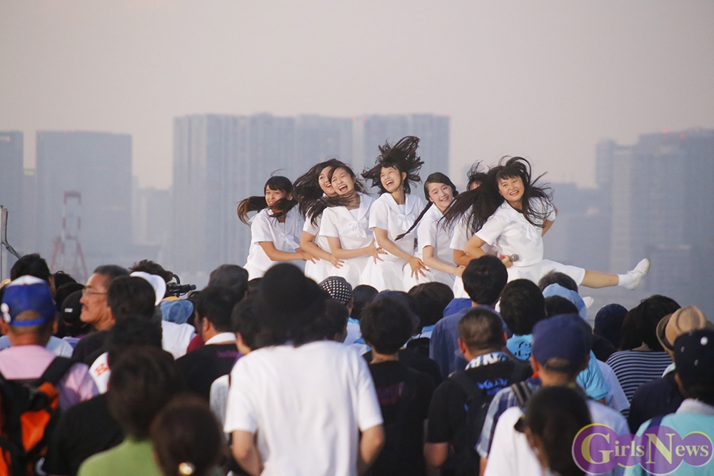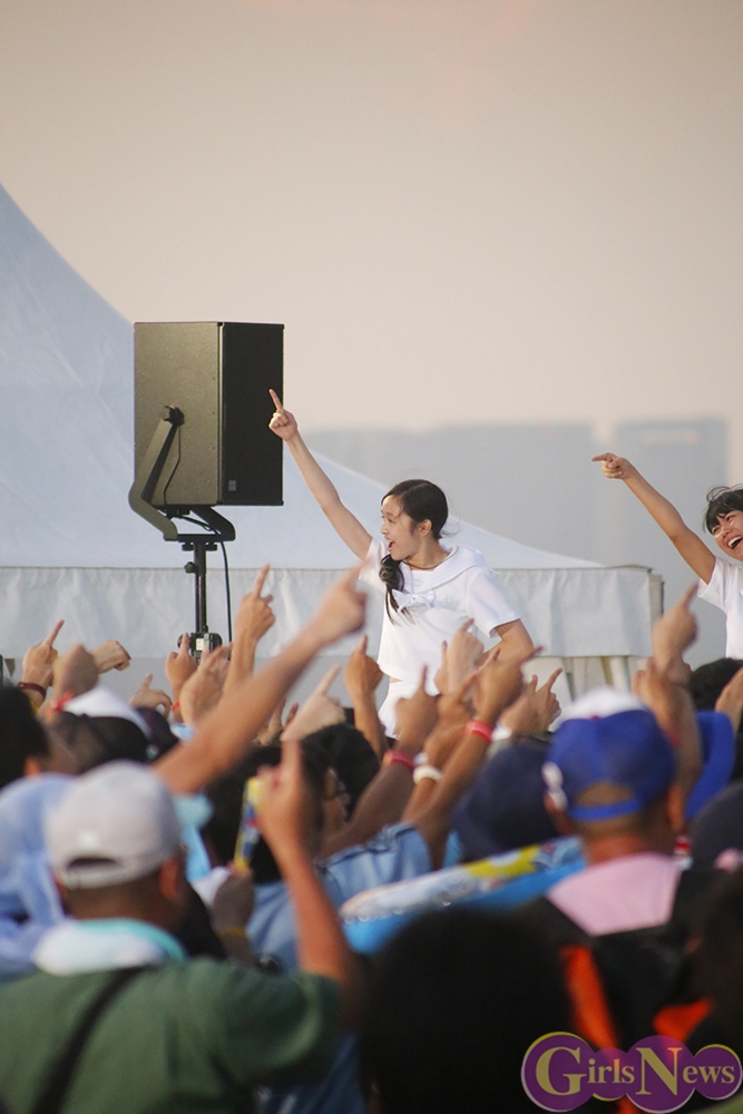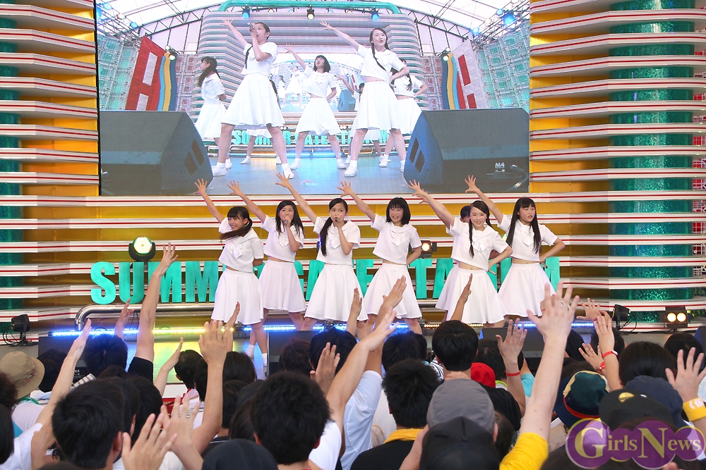この企画ステージでの司会、オテンキのりがスタートの合図をすると聴こえてくる祭囃子。比嘉奈菜子、宮本茉凜、橋本佳奈が夏の想い出の大きな白い寄せ書きのフラッグを掲げ颯爽と登場すると、音楽に合わせて残りのメンバーも『お祭りマンボ』で広いステージを無尽に駆け回る。