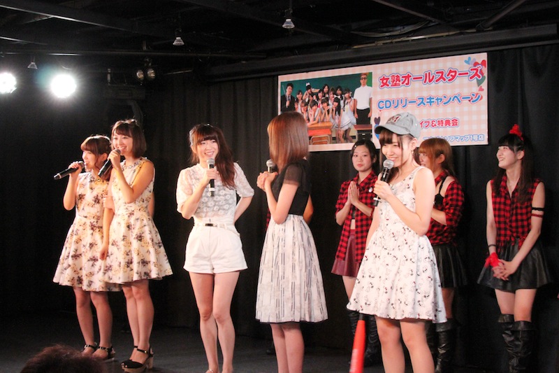 トークパートでは、オリコン10位に入らなければ即解散という条件でメジャーデビューした女塾オールスターズだが、このままじゃ10位は厳しそうだというメンバーのトーク中、「魔法使いなんだからなんとかしてよ」と無茶ぶりされたアフィリア・サーガのミクが「私、まだ見習い魔法使いだから、そういう事は出来ないんです?」とボケて会場の笑いを取るなど、バラエティ番組から生まれたユニットらしい面白トークを披露。特典会では、尻無浜冴美とミクがお揃いのワンピースで登場するなど、サービス精神あふれる趣向でファンを魅了した。