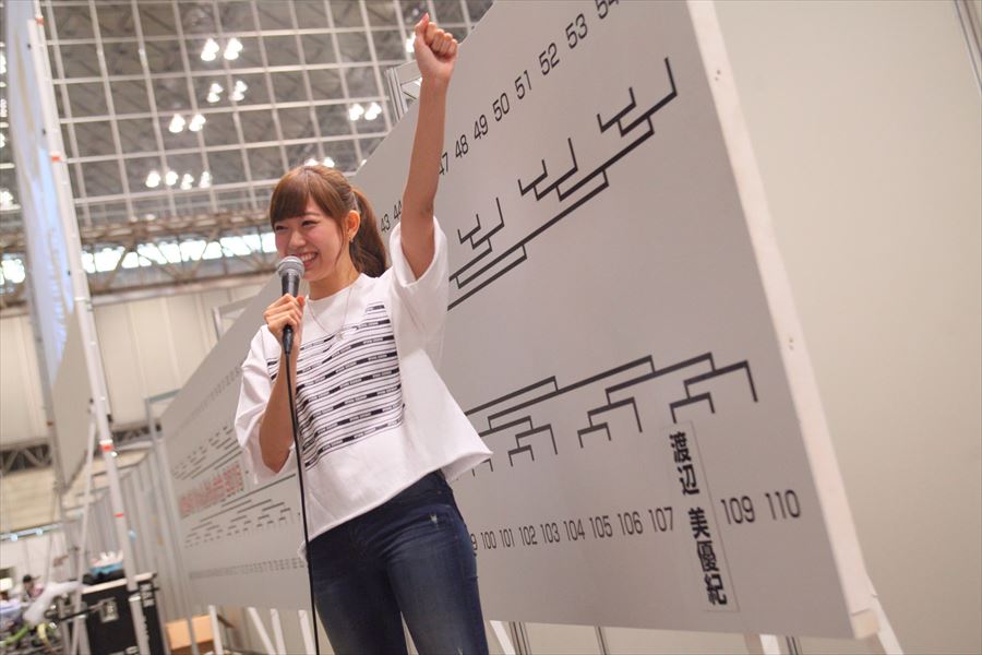 100名以上の参加者の中で1番目にくじを引いたのは、前回大会で優勝し見事ソロデビューを勝ち取った渡辺美優紀。昨年は最後の番号を引きシードを獲得した為、今年もシードを狙った渡辺でしたが、残念ながら叶わず。それでも「連覇目指そうかな…」と、やんわりとV2宣言をした(1回戦対戦相手:宮崎美穂)。