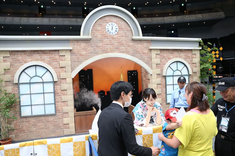 会場では、松井玲奈が“DJ玲奈”として選曲したオリジナルプレイリストをBGMで流したり、「太陽(松井珠理奈)」「愛(高柳明音)」「恩人(谷真理佳)」などSKE48メンバーが“松井玲奈を漢字で表現した色紙”を掲示。また、本人がこれまでに着用した思い出の衣装5着の動画をスクリーンに投影し、ファンの方にお渡し会までの時間を楽しんだ。
