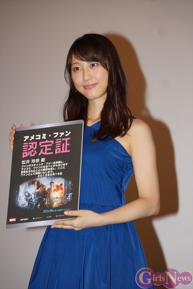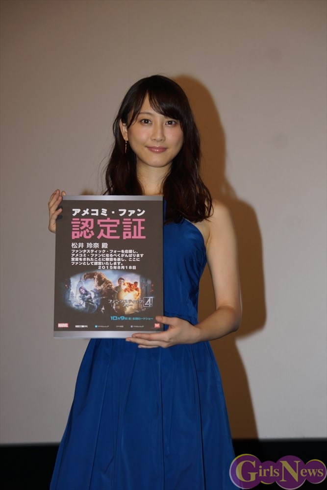 ファンタスティック・フォーの登場キャラクターでお気に入りなのはどのキャラクターなのか聞かれると「私、燃えちゃう人です。」と明かすと、「今回“ファンタスティック・フォー”を観てさらに興味が沸いて来たので、もっともっと(アメコミを)好きになっていけたらいいなと思いました。」とアメコミ好きになりたいことを語ると、アメコミ・ファンの前で「私、松井玲奈はこれからアメコミ・ファンになるように努めて行きたいと思います!」と宣言。