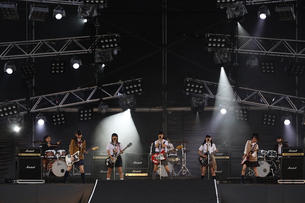 開演前の諸注意を促すアナウンスに続き、唐突にオープニングアクトの紹介で「五五七二三二〇」がステージに登場。「五五七二三二〇」は、ココナッツサブレ50周年を記念して結成された、女子中学生8名によるパフォーマンスユニット。今年3月25日に全世界同時発売した配信限定シングル「半世紀優等生」を、ギター5名+ドラム3名という超変則体制で攻撃的かつ挑発的なパフォーマンスで披露すると、一言も発することなくステージを降り会場の度肝を抜いた。