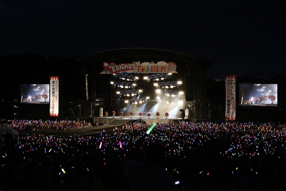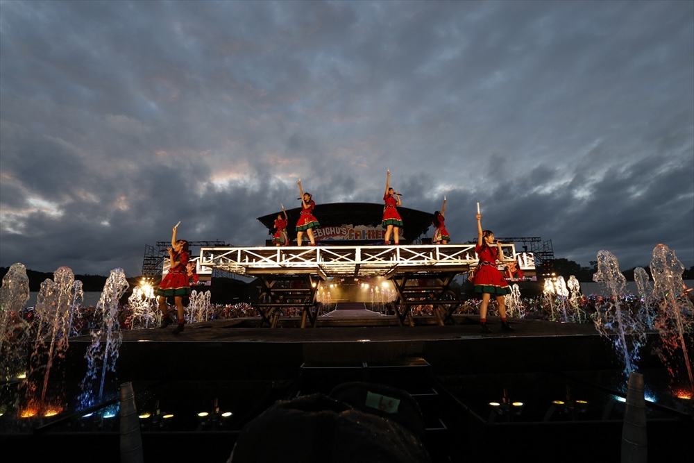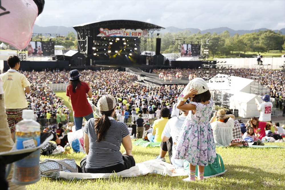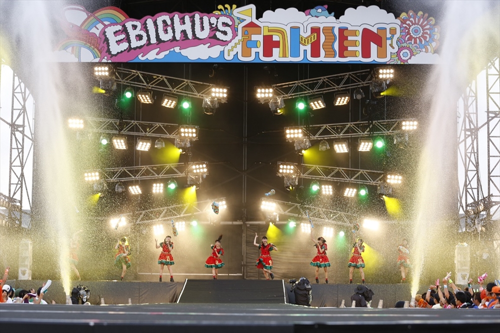 続いてステージ下手に設置された櫓に登場した小林雅彦(国営越後丘陵公園管理センター長)氏から祝辞が述べられ、センター長自らの曲紹介によっていよいよメインアクト・エビ中のステージがスタート。オープニング楽曲は、6月17日に発売された「夏だぜジョニー」【通常盤】収録で、柏木ひなた(出席番号10番)と竹富聖花がW主演をつとめた映画『脳漿炸裂ガール』の主題歌で、<れるりり>原作の大ヒットボカロ曲のカヴァー「脳漿炸裂ガール」!この高速チューンをキレのあるダンスで見せつけるも、目を凝らすとダミーダンサー(影武者)によるパフォーマンスであることが判明!そんな中、呆気にとられる観客を尻目に、SE(ebiture)に合わせてエビ中メンバーが変形自転車に乗って客席後方から登場。浴衣を思わせるピンク色のキュートな花柄の衣装に身を包んだメンバーが勢いよくセンターステージに駆け上ると、やっと(?)エビ中本編のライヴがスタートした。この曲なくして「ファミえん」は始まらないだろう「ご存知!エビ中音頭」からニューシングル「夏だぜジョニー」、そして「ほぼブラジル」とサマーチューンを立て続けに連発。おなじみとなったのステージ上でかき氷を頬張りながらののんびりトークなどを挟み、ステージはどんどん進行していく。なかでも今年は噴水に加えて、強力なウォーターキャノンを配備。ステージ前方はおろか、花道やセンターステージ周辺のファミリーは水浸しになりながら、“水の饗宴”を楽しんだ。「揚げろ!エビフライ」や「Go!Go!Here We Go!ロック・リー」、「未確認中学生X」と徐々にヒートアップしていくパフォーマンスは、松野莉奈(出席番号9番)の「なんかこの後すごくすごく激しくて大変なことになる気がする…」とセットリストを知っている松野の確信に満ちた予言通り、「いつかのメイドインメイドインジャピャ~ン」「放課後ゲタ箱ロッケンロールMX」「金八DANCE MUSIC」とハイパーチューンをノンストップで、しかもセンターステージは言うに及ばず、櫓ステージまでも使用してのステージングで観客を熱狂させた。その後のMCで、廣田あいか(出席番号6番)の口から、「9枚目のシングル発売が10月21日に決定した」ことをファンに報告。全員で告げられたタイトル「スーパーヒーロー」の発売に、会場からは喜びの声が上がった。そんな会場の熱を冷ますべく、バラード曲「いい湯かな」に始まったセットリストはいよいよライヴ終盤に差し掛かる。暮れかけた辺りににサイリウムがきらめく「フレ!フレ!サイリウム」を歌い終え、メインステージへと戻るメンバーに、突然のサプライズ!「年忘れ大学芸会 さいたまスーパーアリーナ開催決定!」「12月12日(土)・13日(日) 最大規模の2Days!!」の垂れ幕がステージ横に下ろされると、歓喜して喜ぶメンバーをファミリーによる祝福の拍手が包み込んだ。その後のMCで、真山りか(出席番号3番)の「あらためて自己紹介を」との曲ふりから、この日初披露となる前山田健一による「出席番号の歌 その2」(未発表曲)をパフォーマンス。最後は、やはり初披露となる「ファミえん」のテーマソングとして8月5日に配信限定で発売された田村歩美(たむらぱん)書き下ろしの新曲「ナチュメロらんでぶー」で本編は幕を閉じた。