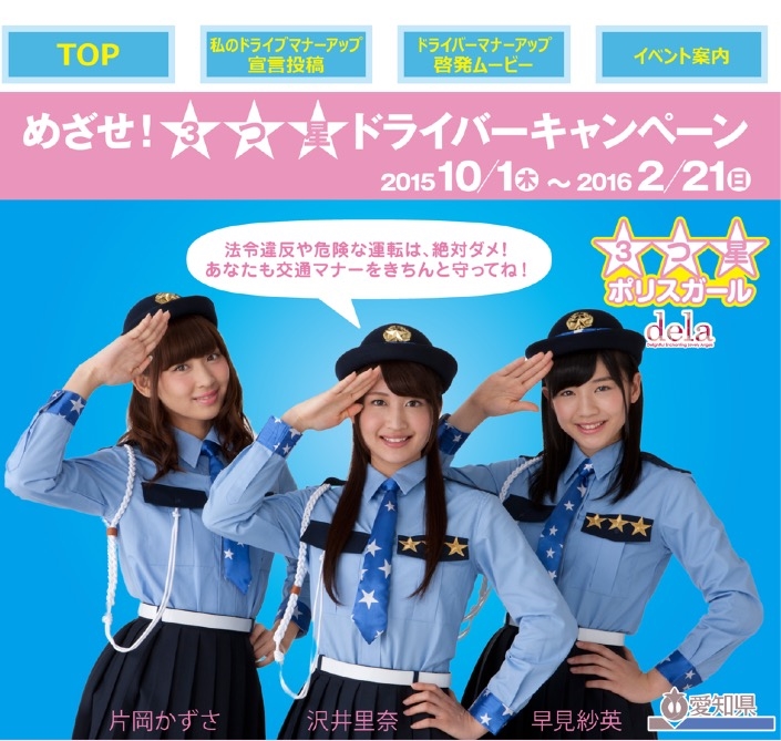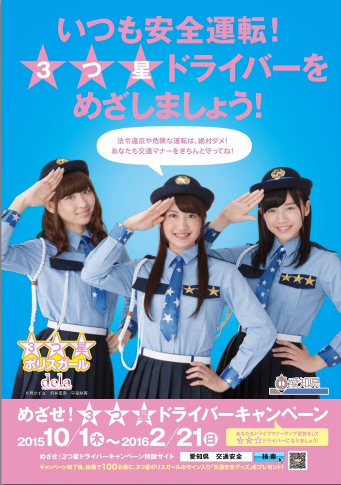 そこで、対策に頭を悩ませる愛知県がその切り札として企画したのが名古屋・愛知県でドラマやCMで大活躍中の美少女アイドルユニット「dela(でら)」扮するポリスガールによる「3つ星ドライバーキャンペーン」だ。