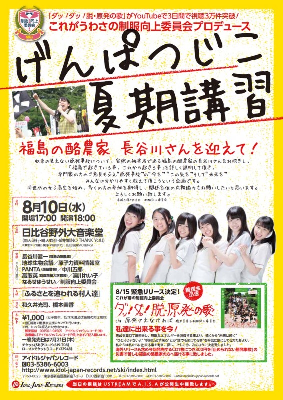 今、YouTubeで「ダッ!ダッ!脱・原発の歌」が話題沸騰の制服向上委員会が、8月10日(水) 18:00から日比谷野外大音楽堂で「げんぱつじこ 夏期講習」を開催することがわかった。
