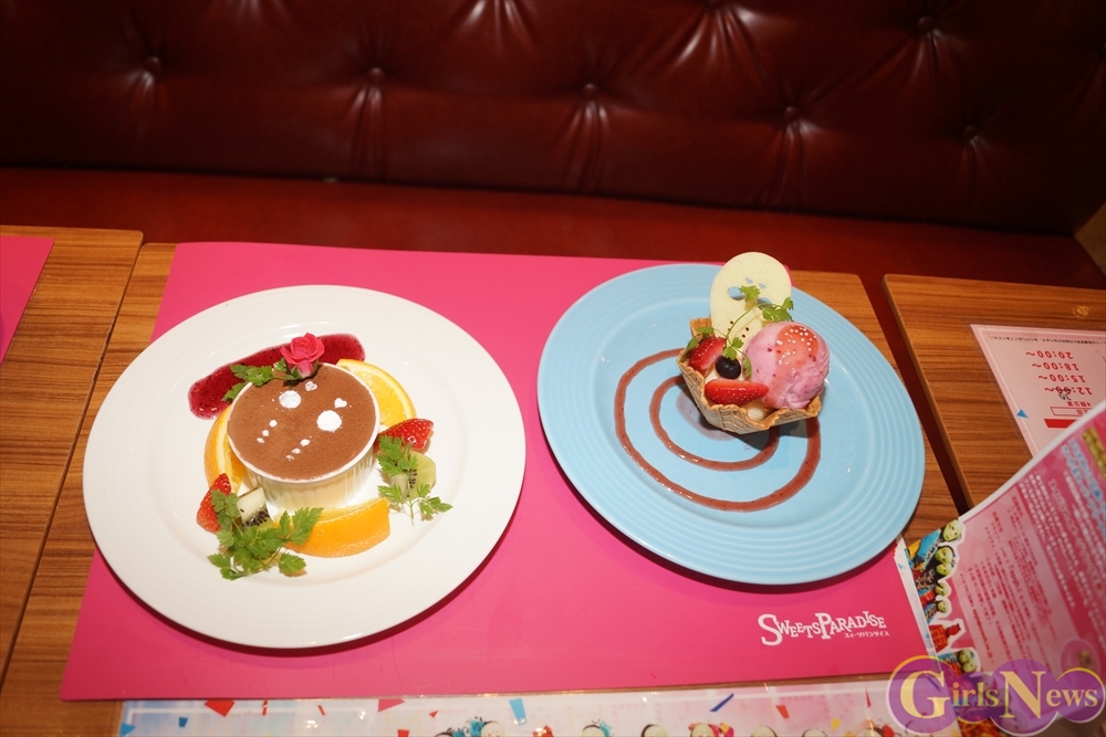 「スイーツパラダイス」新宿東口店では仮面女子とコラボしたスイーツとドリンクが用意され、早速上島竜兵さんと野呂佳代さんが試食。