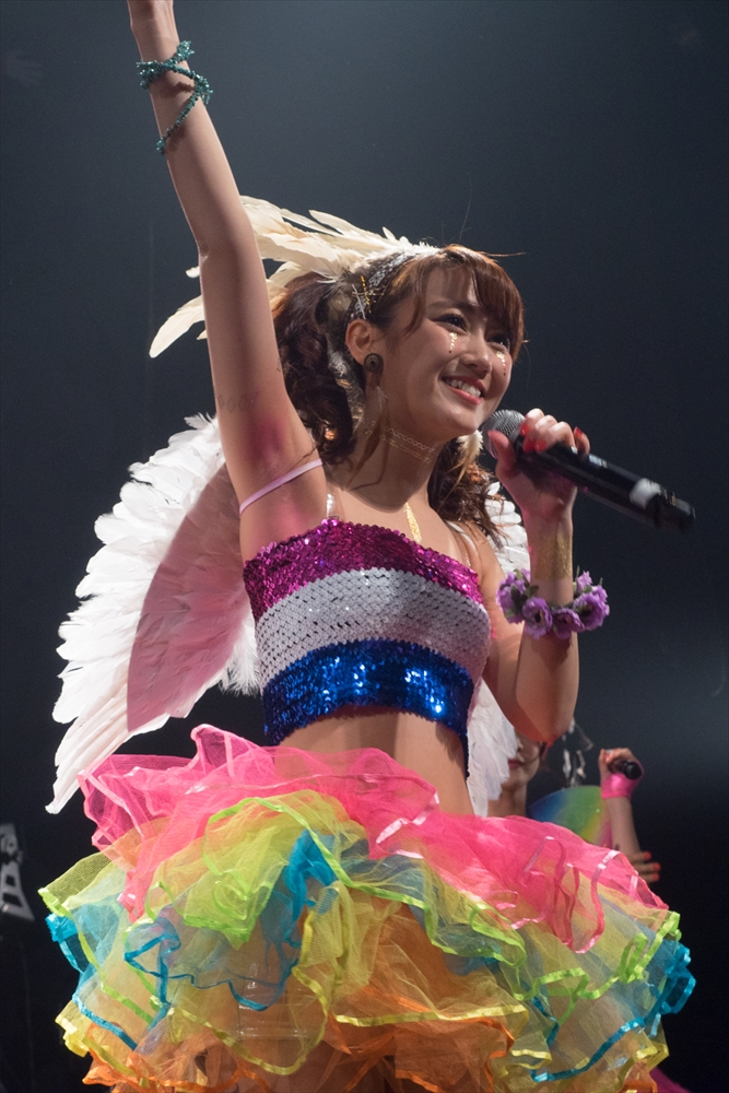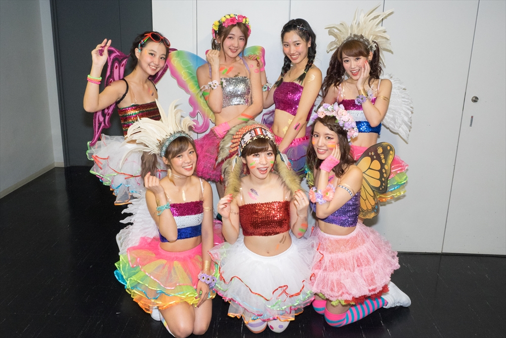 そして、11月1日の『AKASAKA HALLOWEEN 2015「アイドル×お笑い・ハロウィン」』でのアプガは、前日とはガラリと雰囲気を変えて、世界最大のEDMフェス『ULTRA MUSIC FESTIVAL』にいる、パーティピープルをイメージした仮装で登場。7人は、羽根や花飾りを身につけ、ふわふわなスカートというハッピーモード全開の衣装で、「全力!Pump Up!! -ULTRA Mix-」からバッキバキにフロアをアゲまくる。関根梓は「ハロウィン楽しんでいこうねー!」と叫び、メンバーはアプガ流の汗だくハロウィンワールドに観客を巻き込んでいく。「ENJOY!! ENJO(Y)!!」でアプガは、お菓子を観客に投げ、自撮り棒で写メを撮りまくったりとエンジョイしまくり。「リスペクトーキョー」「アッパーレー!」で会場のボルテージをガンガンにアゲたあとは、新曲「青春の涙」をフルのダンスバージョンで披露する。切なく燃えるダンスチューンで、7人は広いステージを存分に使い、ダイナミックに魅せるパフォーマンスで観客をグッと引きつけた。