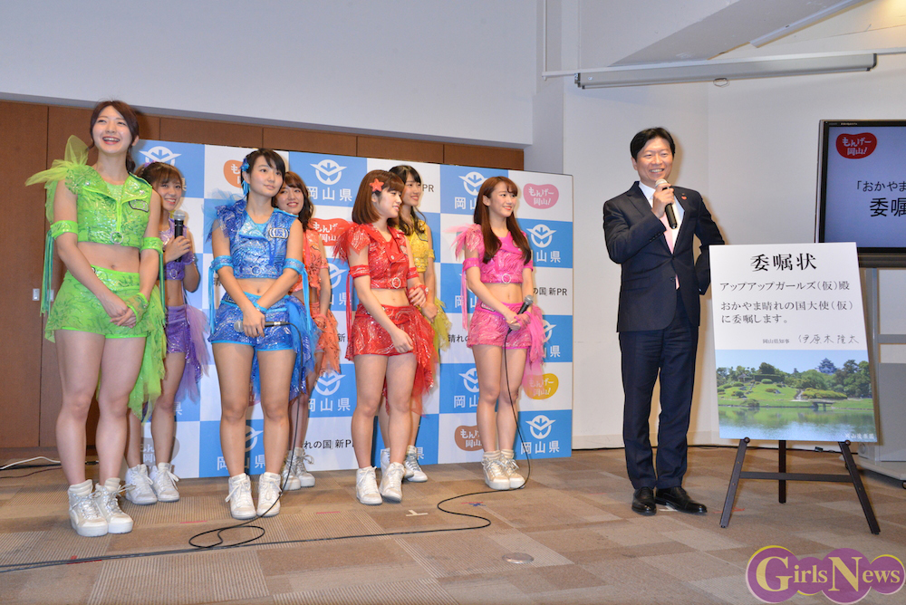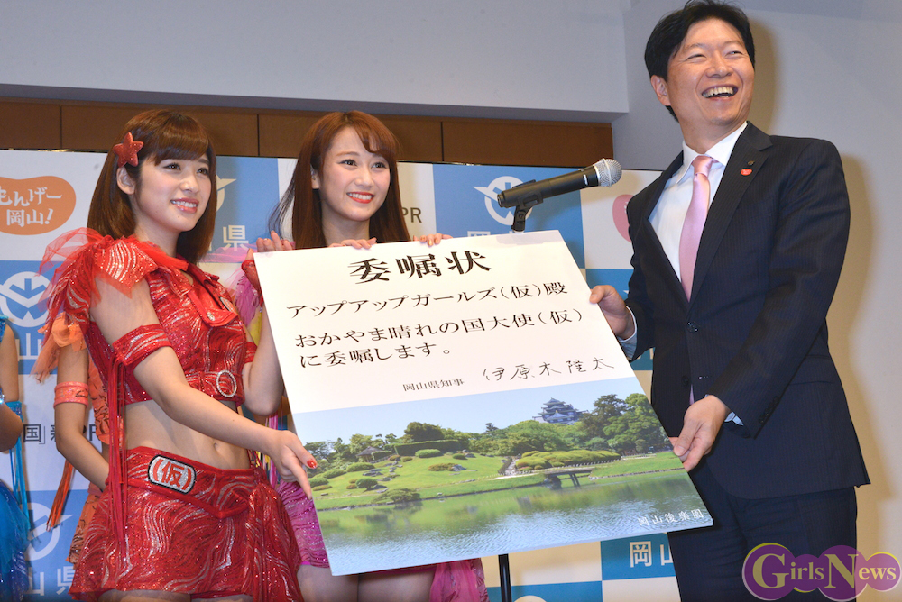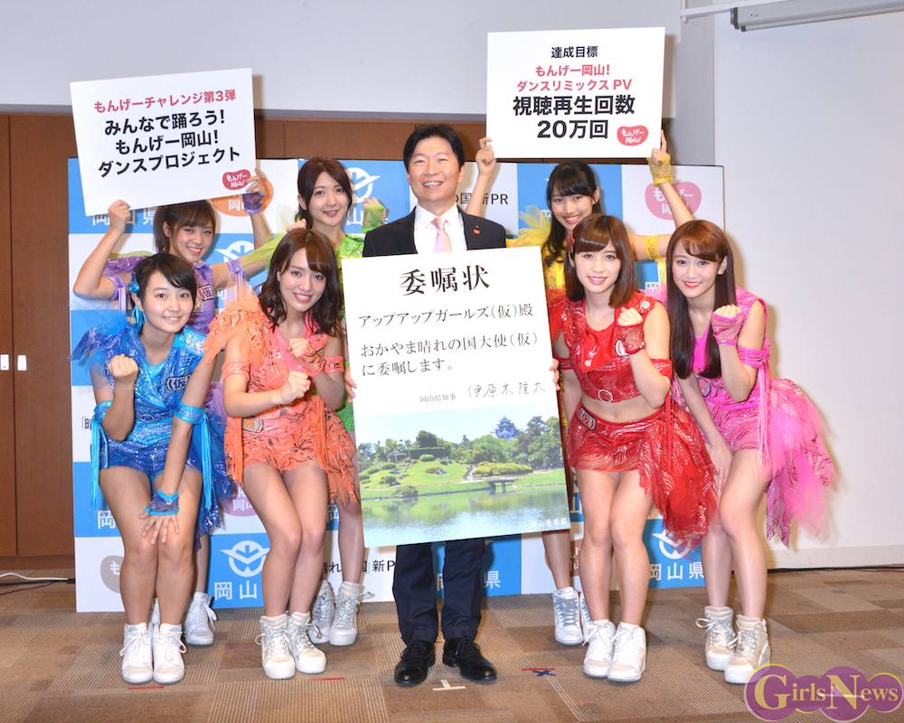 11月11日、もんげー岡山!「おかやま晴れの国大使(仮)」委嘱状交付式がとっとり・おかやま新橋館で行われ、もんげー岡山!「おかやま晴れの国大使(仮)」に就任するアップアップガールズ(仮)と伊原木隆太岡山県知事が登壇した。