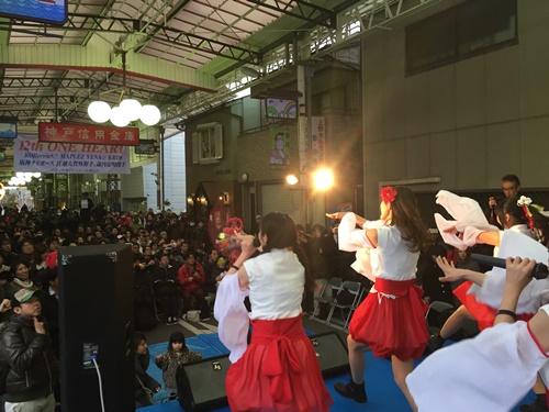 ライブでは、商店街を盛り上げるため自身の持ち曲を震災復興バージョンに替え歌。商店街を大いに盛り上げた。震災の年に神戸で生まれた高本翔菜さんと宮脇愛さんはグループを代表として挨拶。涙ぐむ場面もあった。