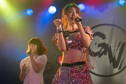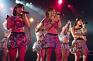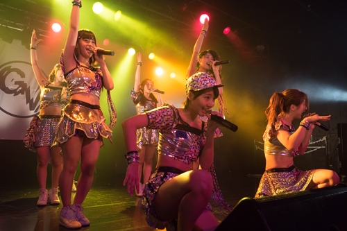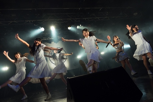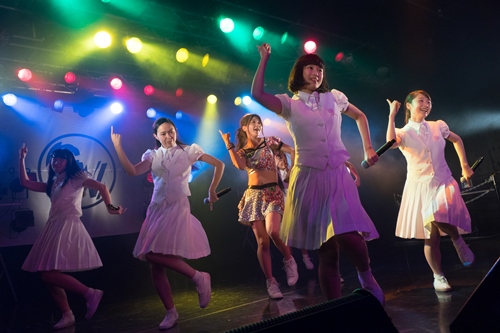 “後攻”のアップアップガールズ(仮)は、『バレバレ I LOVE YOU』でポップにスタートし、続いて桜の季節にぴったりな『SAKURA DRIVE』を爽やかに聴かせた。対バンライブでは冒頭から力強いアップテンポのナンバーでガツガツに攻めることが多いアップアップガールズ(仮)だが、この日は意外性のある選曲でファンを驚かせた。『NextStage』『リスペクトーキョー』などの人気曲に続いて、ライブ定番曲『チョッパー☆チョッパー』から一気にヒートアップ。『ジャンパー!』『お願い魅惑のターゲット』でさらなる盛り上がりを見せてフィニッシュ。