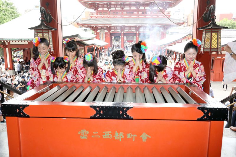 この日は、10人のメンバー中8人が集まり、浅草寺でヒット祈願を行ったが、雷門から本堂に行くまでの参道を「民謡ガールズです! よろしくお願いします!」と元気にPRしながら練り歩く中、大勢の観光客や参拝者に声をかけられたり、写真を求められたりしていた。賽銭箱の前で「ミニアルバム『民謡ガールズ』がヒットしますように…」と全員で手を合わせ、「このデビュー・ミニアルバムを大ヒットさせ、民謡ガールズの歌(民謡)を世界の人たちに届けたい」とヒットに意欲を燃やした。