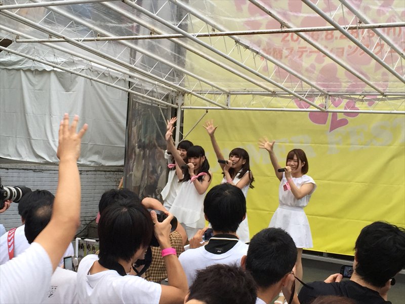 今回が初の野外イベントということで、会場は小桃音まいさんのユニット姿を一目見ようと、観覧無料また撮影も可能ということもあいまってか、駅前は多くのアイドルファンでごった返していた。