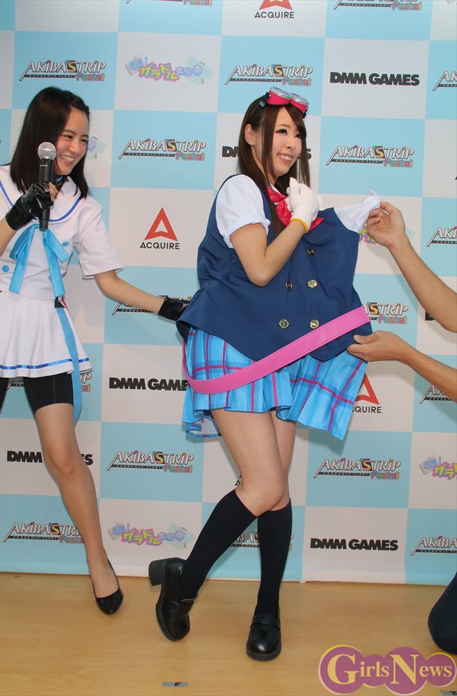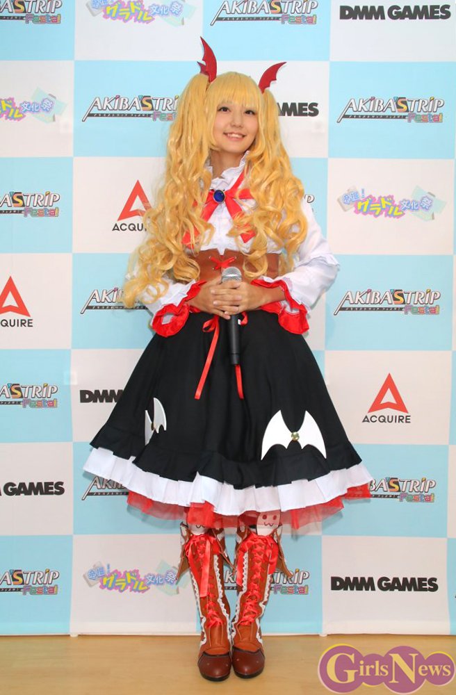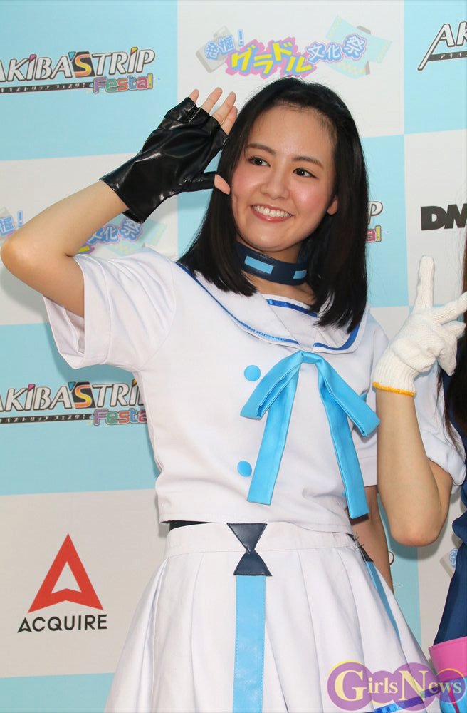 PCブラウザ&スマホ向けネイティブアプリゲーム『AKIBA’S TRIP Fest!』(DMM.GAAMS)の発表会が12日、秋葉原のコンセプトカフェ「発掘!グラドル文化祭」で開催され、アップアップガールズ(仮)の新井愛瞳さんが爽やかなコスプレ衣装で登場した。