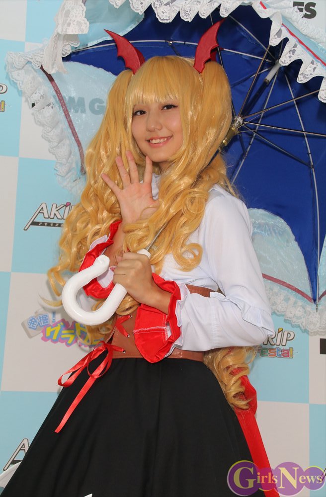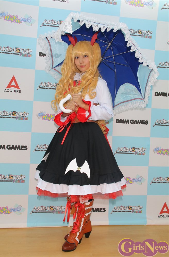 本タイトルのPR大使を務める新井愛瞳さんは初めて美少女ゲームのキャラクターのコスプレに扮し、「いつもは黒髪ショートでボーイッシュな感じなので、フリフリでレースやリボンが付いている衣装はあまり着ないのですが、すごく可愛らしくて着せていただけて嬉しいです」と喜んでいた。