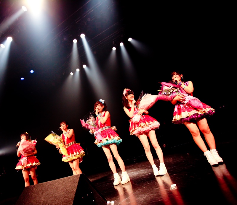 そして、本編最後のMCで現時点での集客数が発表された。恐る恐る結果の書かれた紙を開くメンバー。その数は583人、当初から目標に掲げていた500人を超える数字にメンバーは歓喜の声をあげた。そして会場からも祝福の声が。サプライズでファンからメンバーに花束が手渡された。