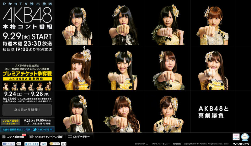 AKB48が初の本格コントに挑戦する番組が9月29日よりひかりTVで放送され、初回放送の拡大版としてAKB48のメンバーが生出演するプレミア試写会がニコニコ生放送で行われる。このプレミア試写会を視聴することができるプレミアチケット争奪 じゃんけん大会が9月24日(土)から9月28日(水)までの5日間にわたり毎日21時より開催される。