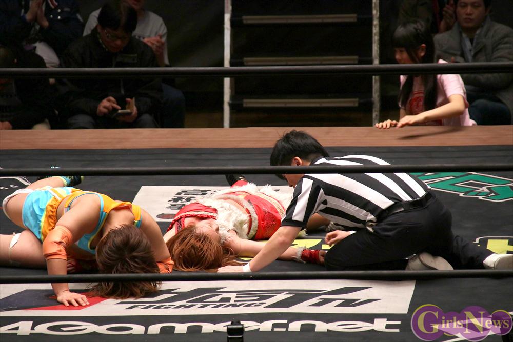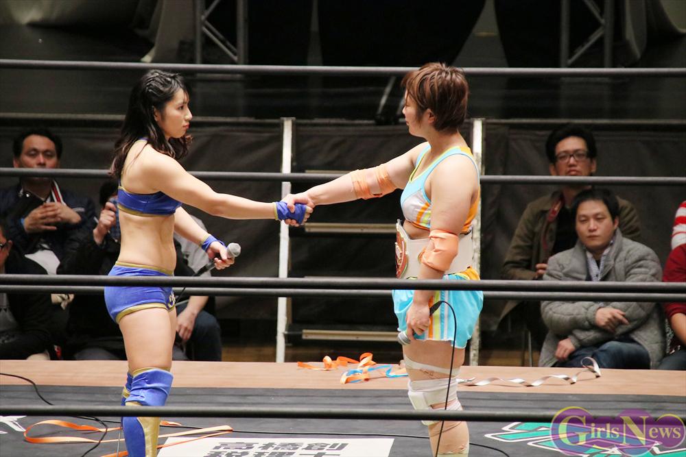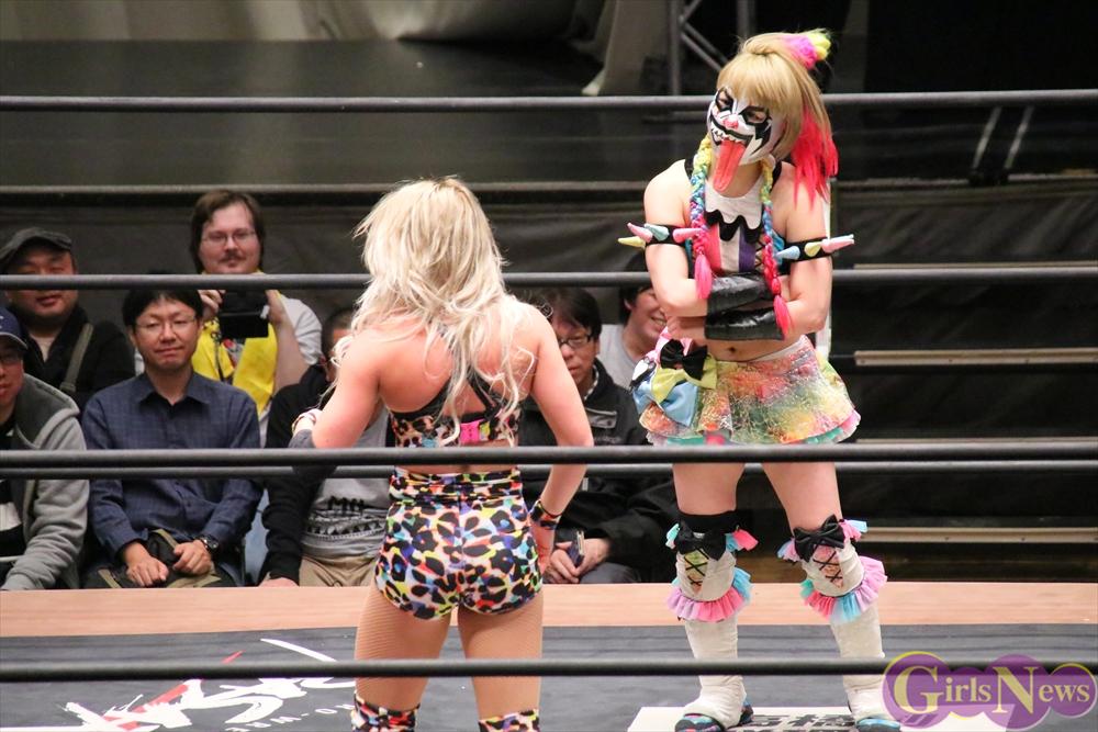 両者は、第四試合の「アイドルサバイバル~どっちが強くてかわいいんだ、ハッキリさせろ!」対決で火花を散らし、パワーと経験に勝る才木が試合をリードしつつも、伊藤は大きな顔を活かした頭突きなどで果敢に応戦した。