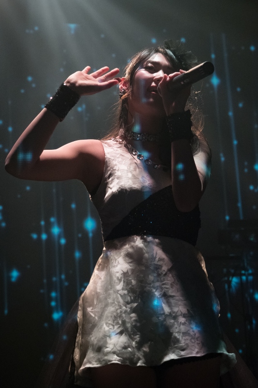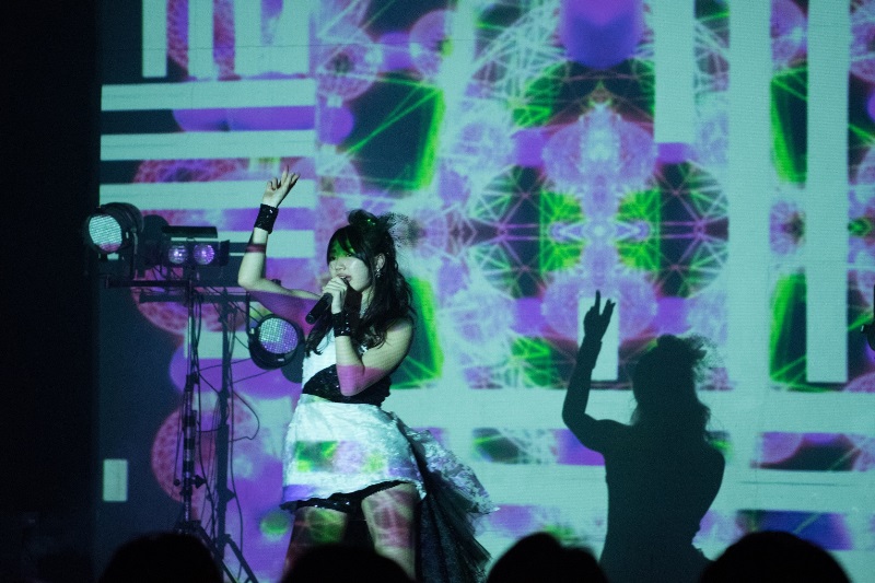 ライブは、エレクトロニックシンガーソングライターfu_mou の楽曲で、佐保さんのソロ曲としても発表された『Abyssal Drop』からスタート。白と黒を基調としたドレスで、感情を込めた歌を聴かせる佐保さん。映像作家ホ ンマカズキの VJ も入り、クールなムードを醸し出す。