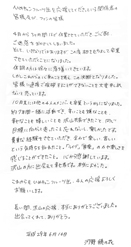 そして岡本真依さんは「5人同時に卒業できないこと、そしてここで卒業してしまうこと、本当に悲しく悔しい気持ちです」 と正直な胸のうちを明かした。だが残り4ヶ月を「『ひめキュン応援しててよかった!』『ひめキュンと関わってよかった!』と、皆様に思っていただけるように、今ステージに立てるメンバーで全力で楽しみ、全力で頑張ります!」と感謝と意気込みを表している。今回の結論はメンバー、スタッフで何度も話し合った上でのことで、各メンバーとも最終的には納得する形だったようだ。