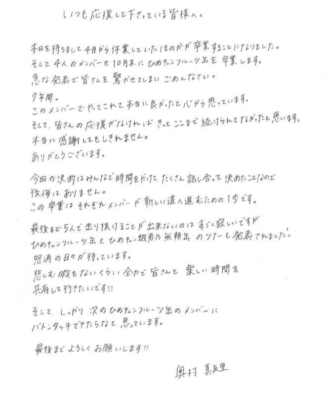 メンバーたちは今回の“卒業”にあたって直筆メッセージを寄せた。奥村真友里さんは「このメンバーでやってこれて本当に良かったと心から思っています。そして、皆さんの応援がなければきっとここまで続けられてなかったと思います。本当に感謝してもしきれません」と気持ちを表した。
