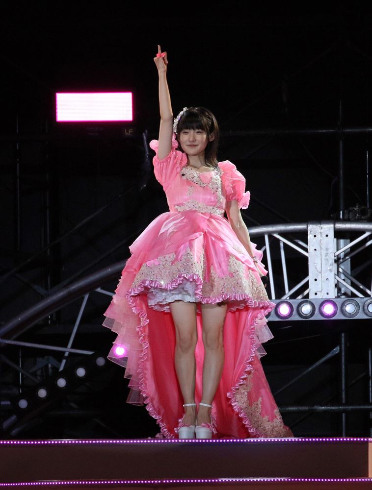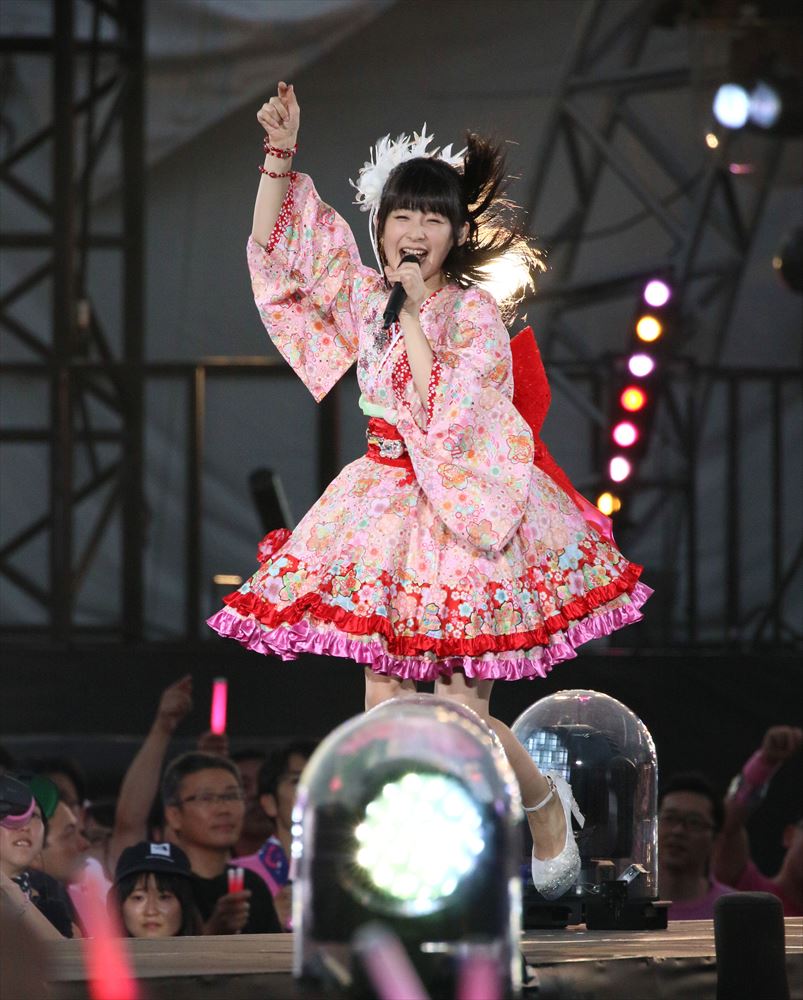 朝食の桃のおかげか、直前まで心配された雨も降ることなく、無事にステージは幕を開け、15周年記念のメドレーを歌う頃には、夕陽が雲間から差し込んで空を照らした。嗣永さんはほとんど1曲毎にメインステージとサブステージを往復し、時には祭りのやぐらのようなゴンドラに乗って、縱橫に会場を駆け巡りファンの近くに寄って歌声を届けた。