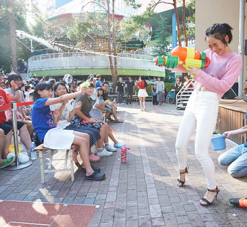 冒頭「約一年ぶりの水ぶっかけイベントに、こんなにたくさんの方が集まってくださって嬉しいです!」(野元空)、「濡れる準備は万端ですか?」(伊藤萌々香)といったメンバーたちの掛け声でイベントはスタート。『恋のロードショー』の曲にのせて、会場のファン2,000人に向けて容赦なく水鉄砲を打ち始めた。
