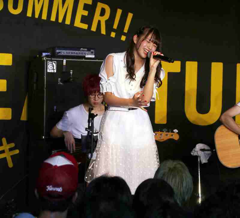 ソロで歌唱するサマーカバーライブということで、三品さん自身が夏にまつわる曲といえばと、選曲した3曲を披露した。まず、一曲目に披露した楽曲はYUIの『SUMMER SONG』。アイドルとは思えない歌唱力で会場を魅了した。