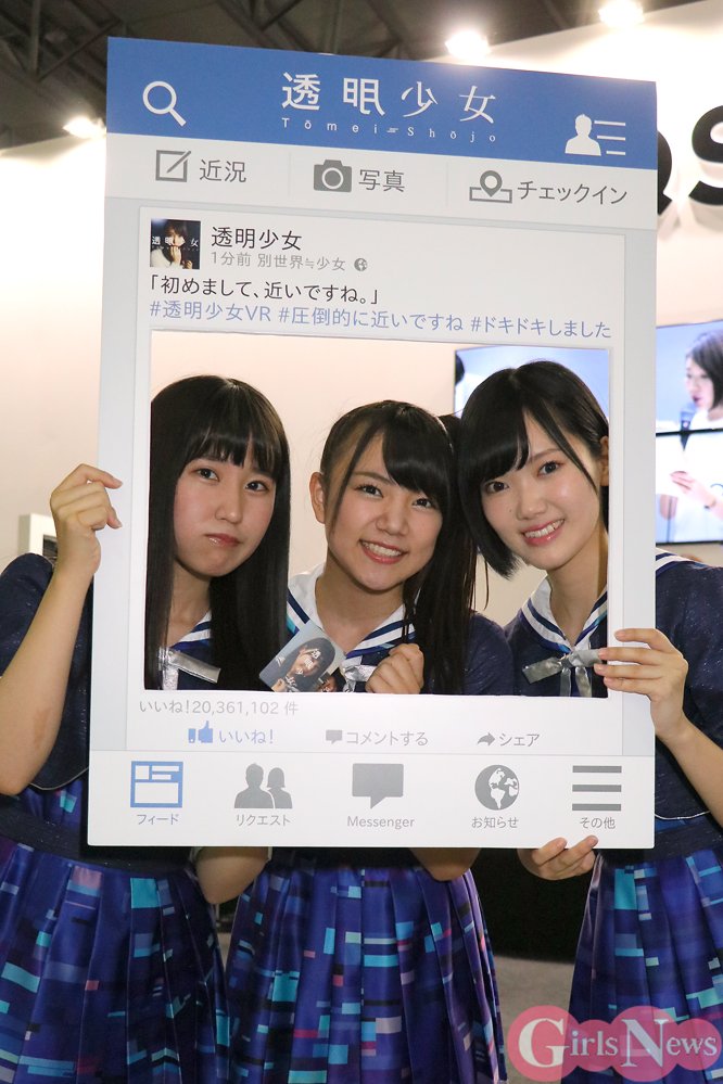 アイドルカレッジ Team D の出演するVRコンテンツ『透明少女』が幕張メッセで開催中の東京ゲームショウ2017(一般公開日は23・24日)VAQSOブースに出展され、21日に行われたお披露目イベントにメンバーの佐藤春奈・石塚汐花・戸沢舞の3名が出席した。
