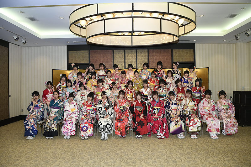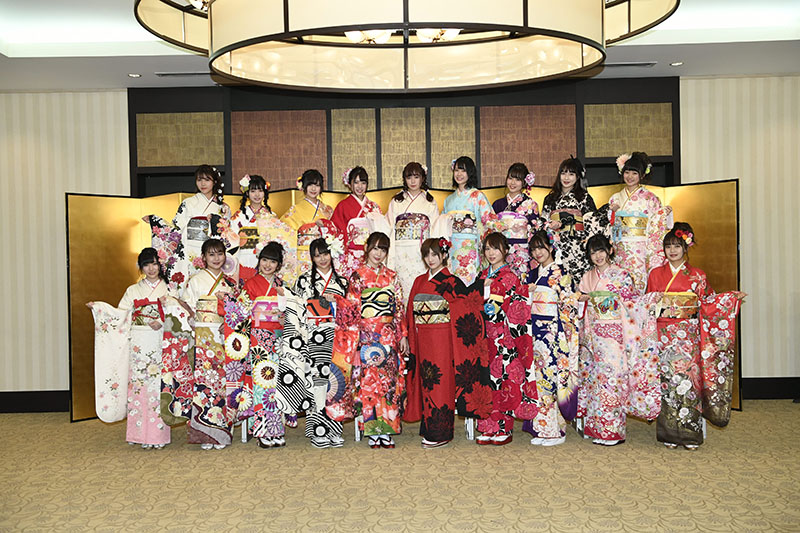 それぞれこの日のために用意した艶やかな着物姿でメンバー40 名(1 名欠席)が成人の儀式に参加。囲み取材の冒頭、各グループの代表が成人の目標を発表した。