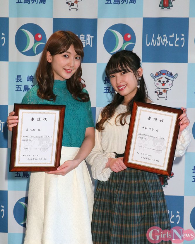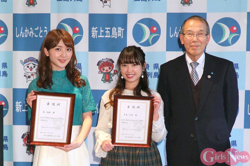 元℃-uteの中島早貴と、アップアップガールズ(仮)の森咲樹が長崎県新上五島町をPRする「GOTO Satoumi アンバサダー」に就任し、記者発表会を12日、都内で開催した。
